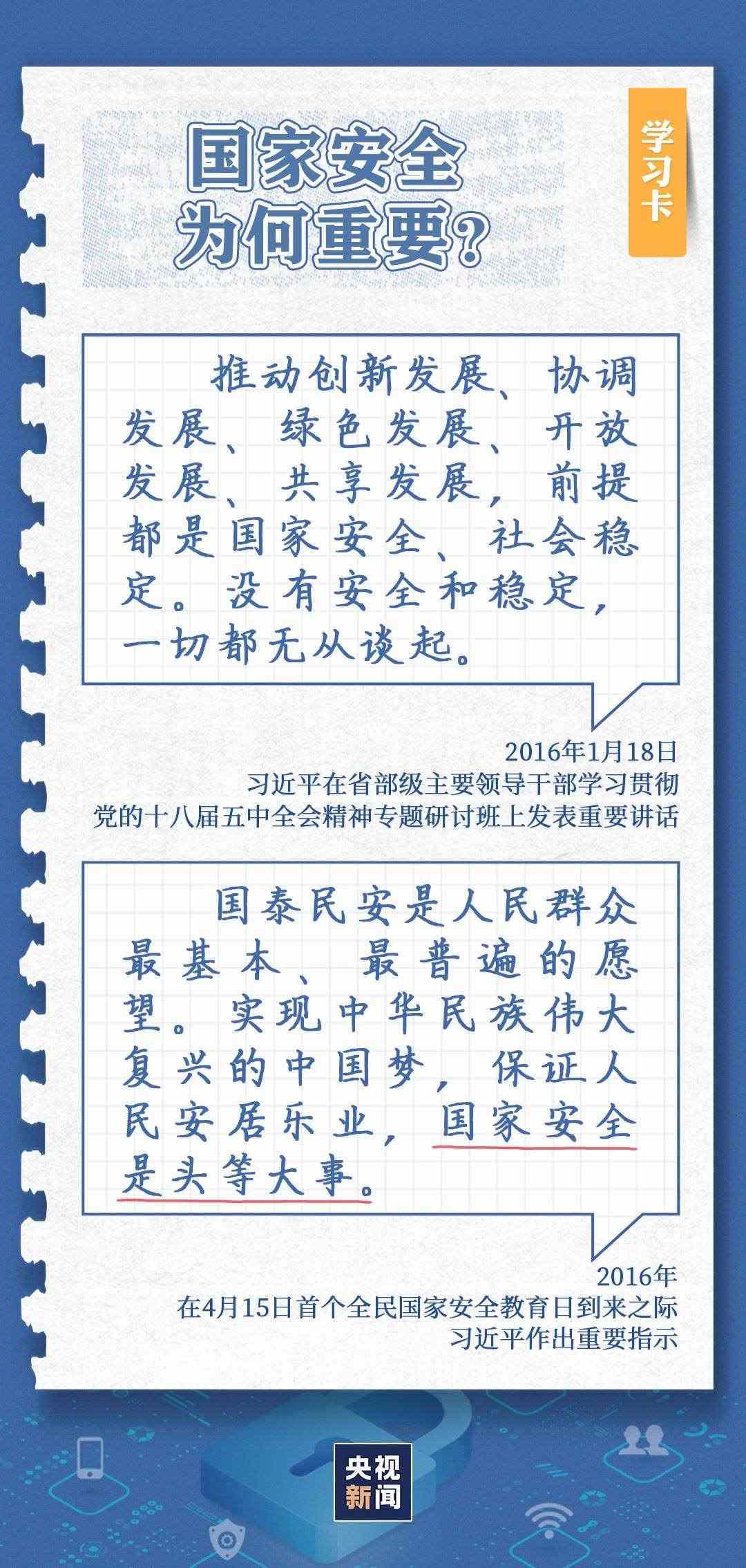 今天(4月15日)是習(xí)近平總書記首次提出總體國家安全觀9周年,也是全民國家安全教育日。“安而不忘危,存而不忘亡,治而不忘亂?!笨倳浽诓煌瑘?chǎng)合多次強(qiáng)調(diào),國家安全是國家發(fā)展的最重要基石、人民福祉的最根本保障。