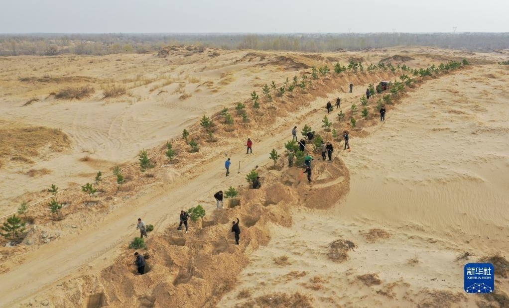 4月15日,在內(nèi)蒙古通遼市科爾沁左翼后旗,治沙工人在科爾沁沙地植樹(shù)造林。