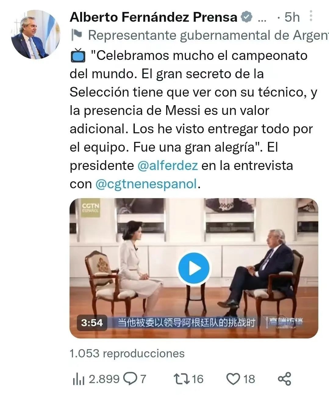 △阿根廷總統(tǒng)費(fèi)爾南德斯個(gè)人賬號(hào)發(fā)布十余條推文展示專訪內(nèi)容