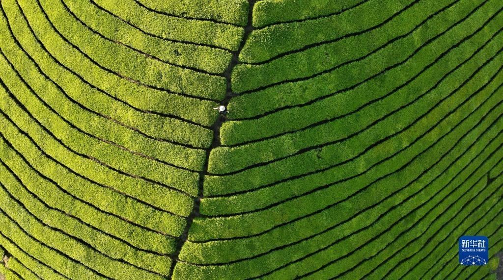 4月16日,茶農(nóng)在鶴峰縣走馬鎮(zhèn)木耳山茶園采茶(無(wú)人機(jī)照片)。