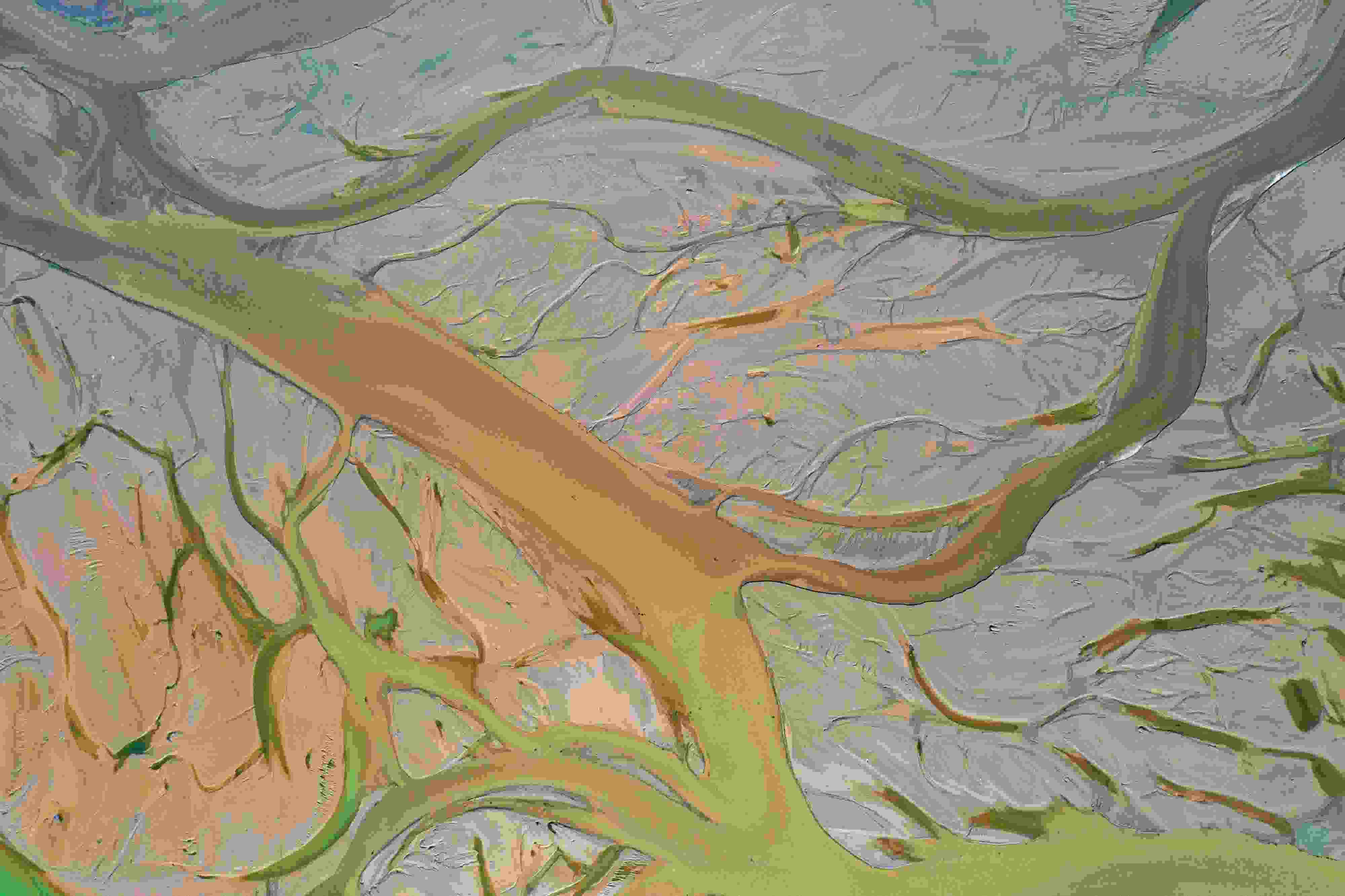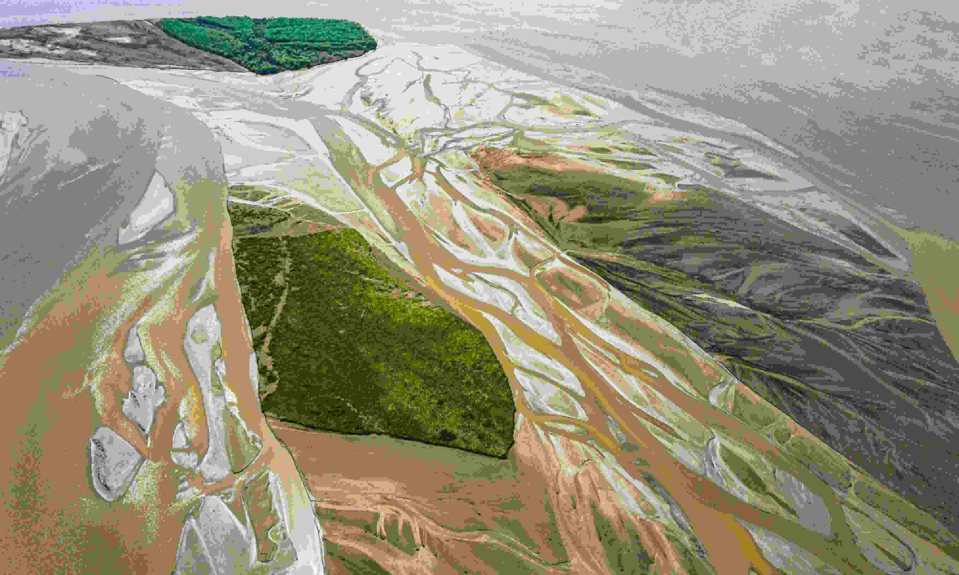 4月16日,山西運(yùn)城,由于黃河上游降雨和庫(kù)區(qū)泄水水量增加,黃河永濟(jì)段河床在水流沖刷下河汊縱橫,高空俯瞰宛若“大地血脈”。 視覺中國(guó)
