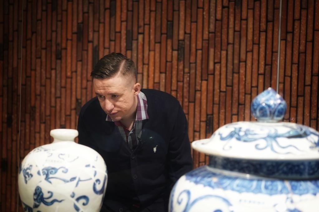 在江西景德鎮(zhèn)御窯博物院的展柜燈光下,一件青花瓷盤散發(fā)著藍白相間的光澤,疏密有致的葡萄紋在盤中心環(huán)繞生長,紋理細節(jié)清晰可見。這件燒制于約600年前的宣德青花葡萄紋菱口盤,吸引了來自烏茲別克斯坦的留學生紹夫卡特·沙穆拉托夫的目光。