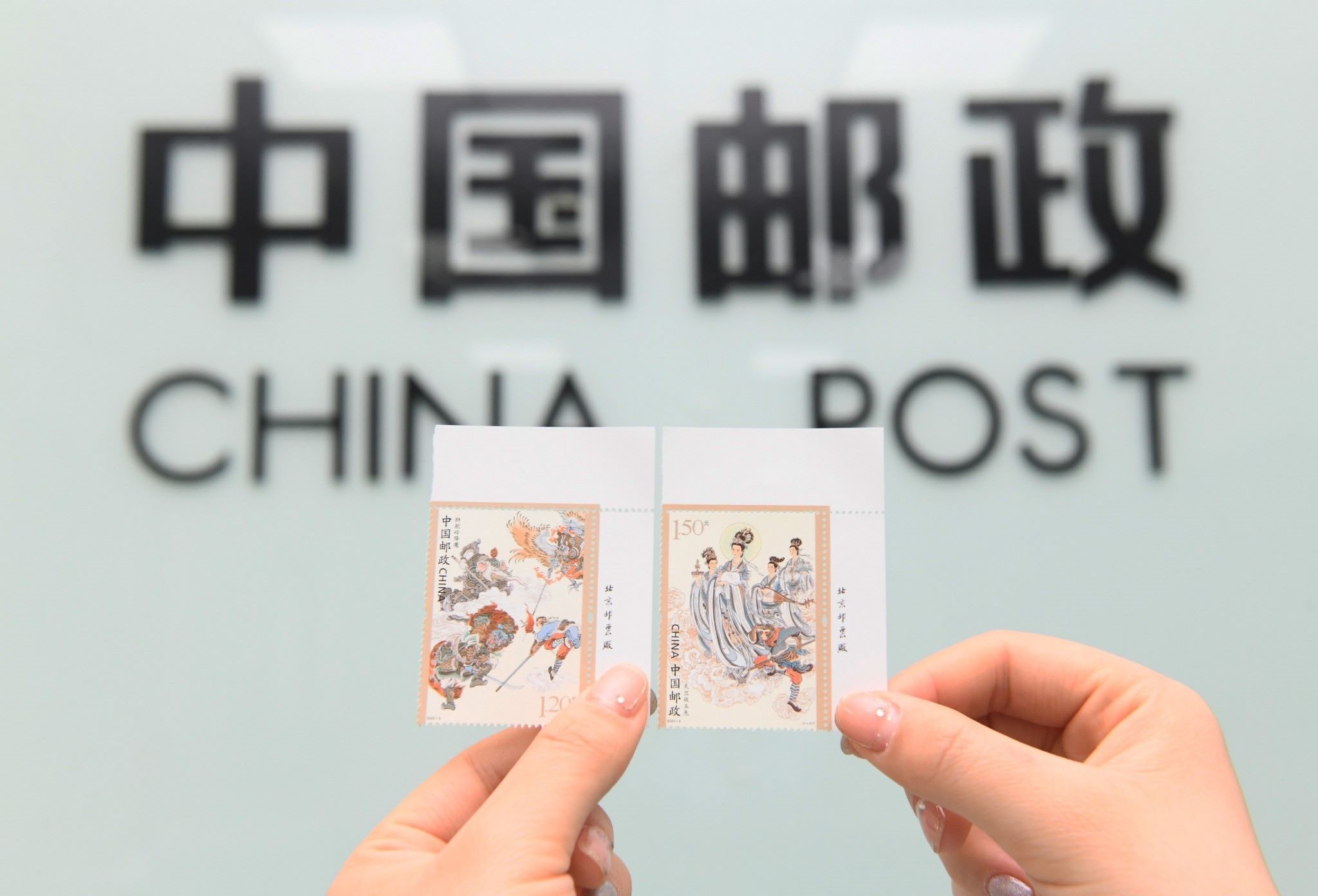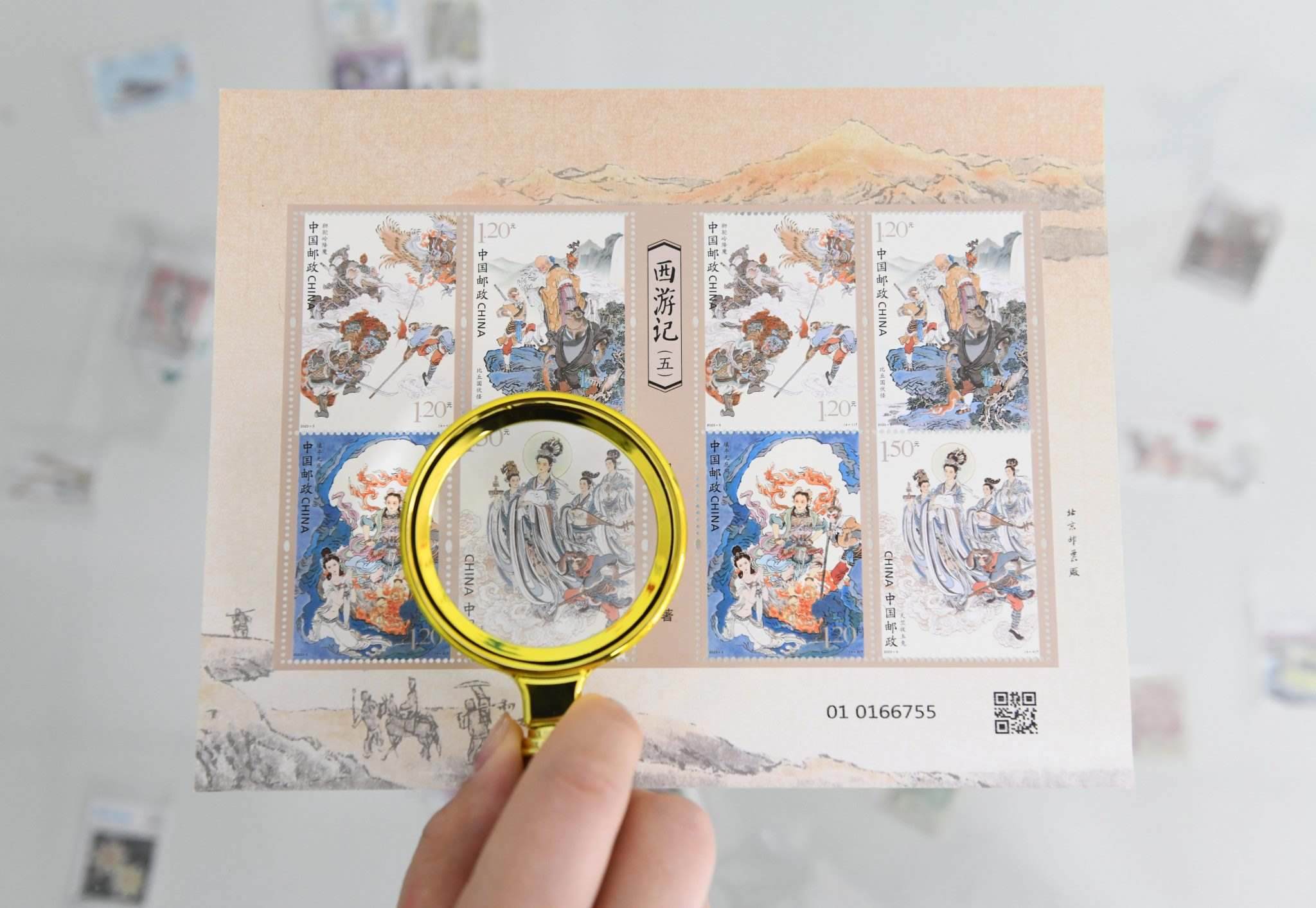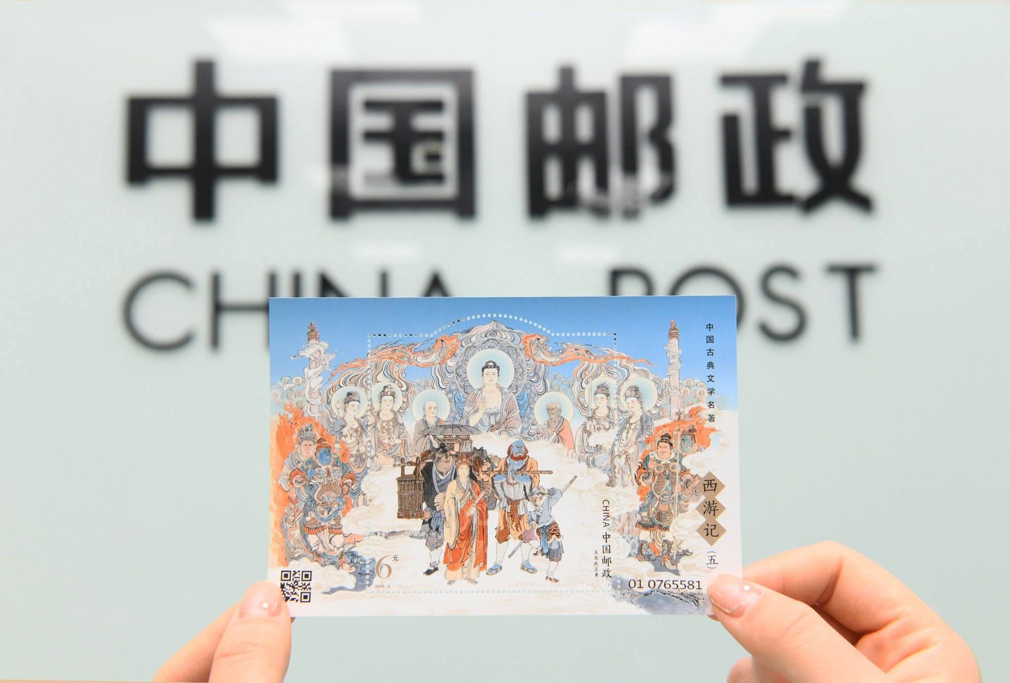 2023年4月27日,中國(guó)郵政集團(tuán)公司河北省新樂(lè)市分公司,工作人員展示發(fā)行的《中國(guó)古典文學(xué)名著—<西游記>(五)》特種郵票。視覺(jué)中國(guó)