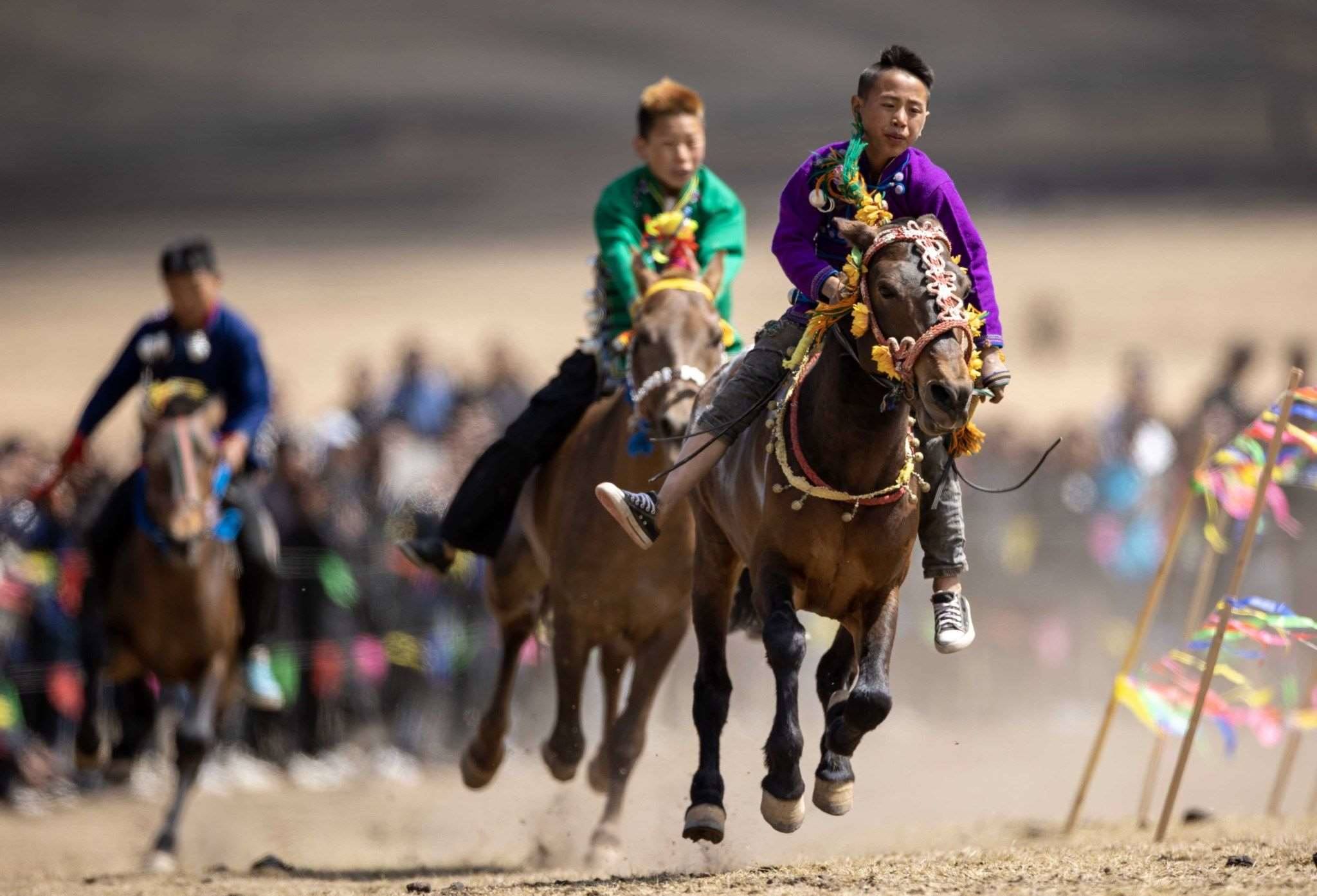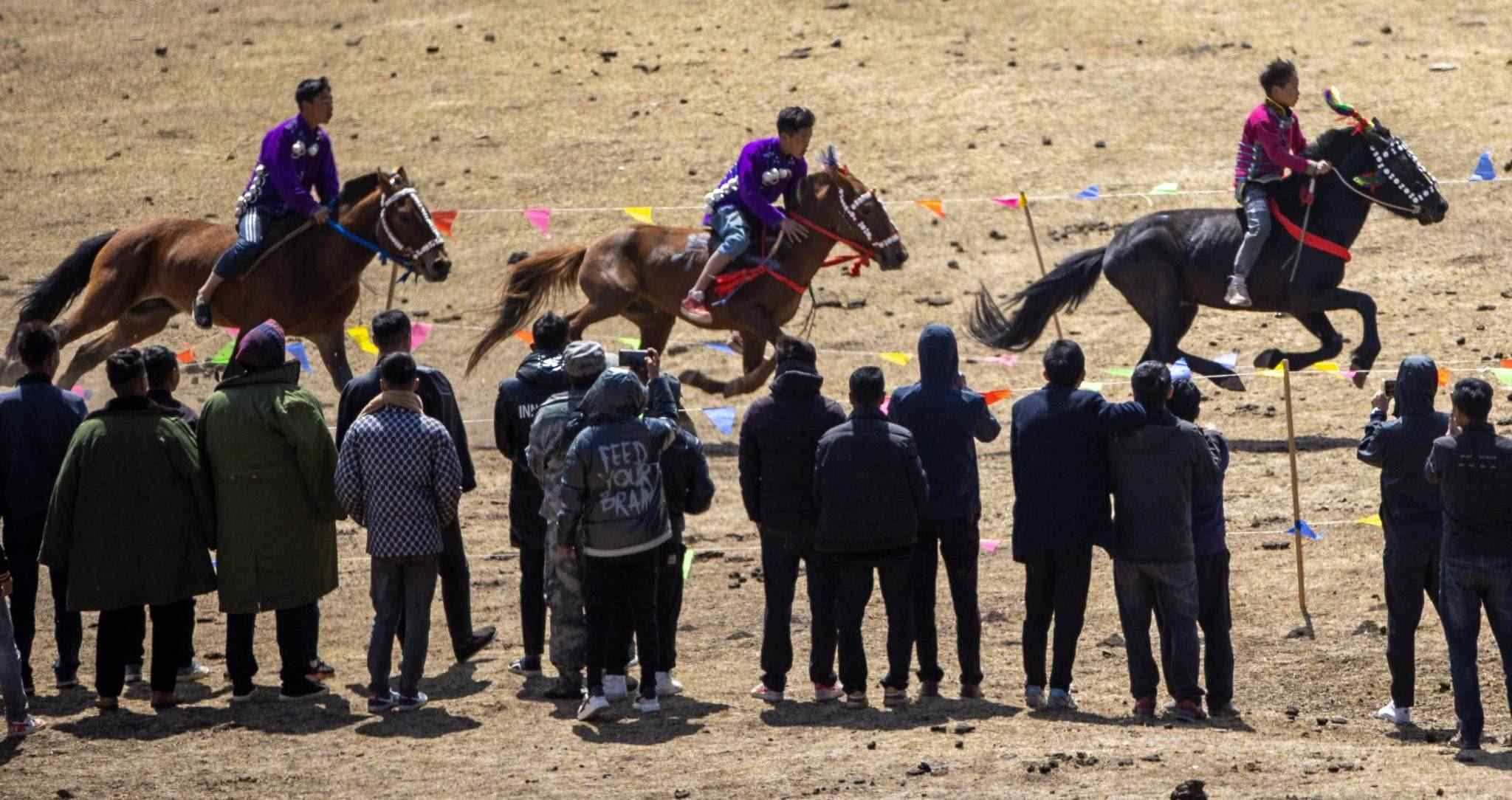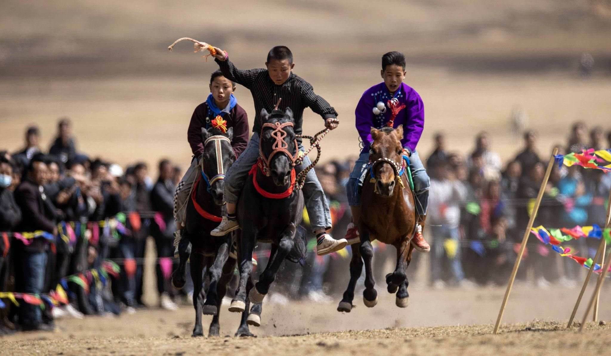 2023年4月25日,四川涼山,普格縣黎安鄉(xiāng)??诹鹤樱瑐鹘y(tǒng)的彝族賽馬比賽拉來帷幕。視覺中國(guó)