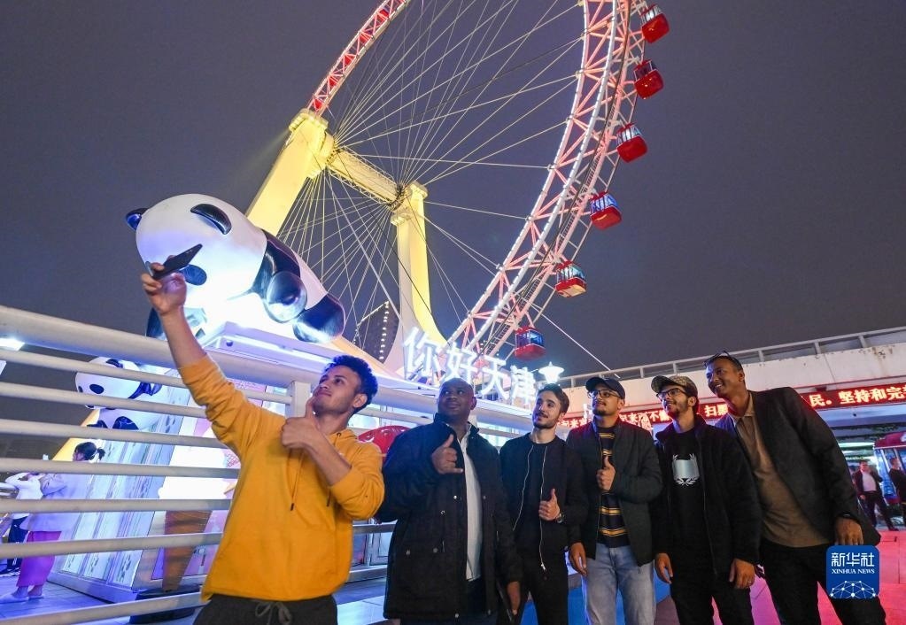 4月27日,北京理工大學(xué)的留學(xué)生在乘坐“天津之眼”摩天輪前拍照打卡。