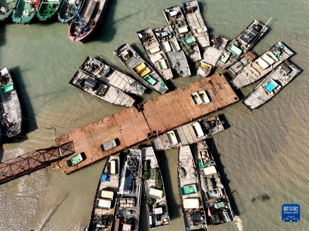 4月30日,在江蘇省連云港市贛榆區(qū)青口漁港碼頭,漁民在卸載漁具,為即將到來(lái)的伏季休漁做準(zhǔn)備(無(wú)人機(jī)照片)。   新華社發(fā)(耿玉和攝)