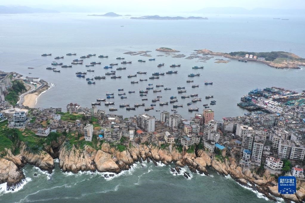 4月30日,準(zhǔn)備休漁的漁船停泊在福建省福州市連江縣苔菉鎮(zhèn)北茭村漁港(無(wú)人機(jī)照片)。   新華社發(fā)(王旺旺攝)