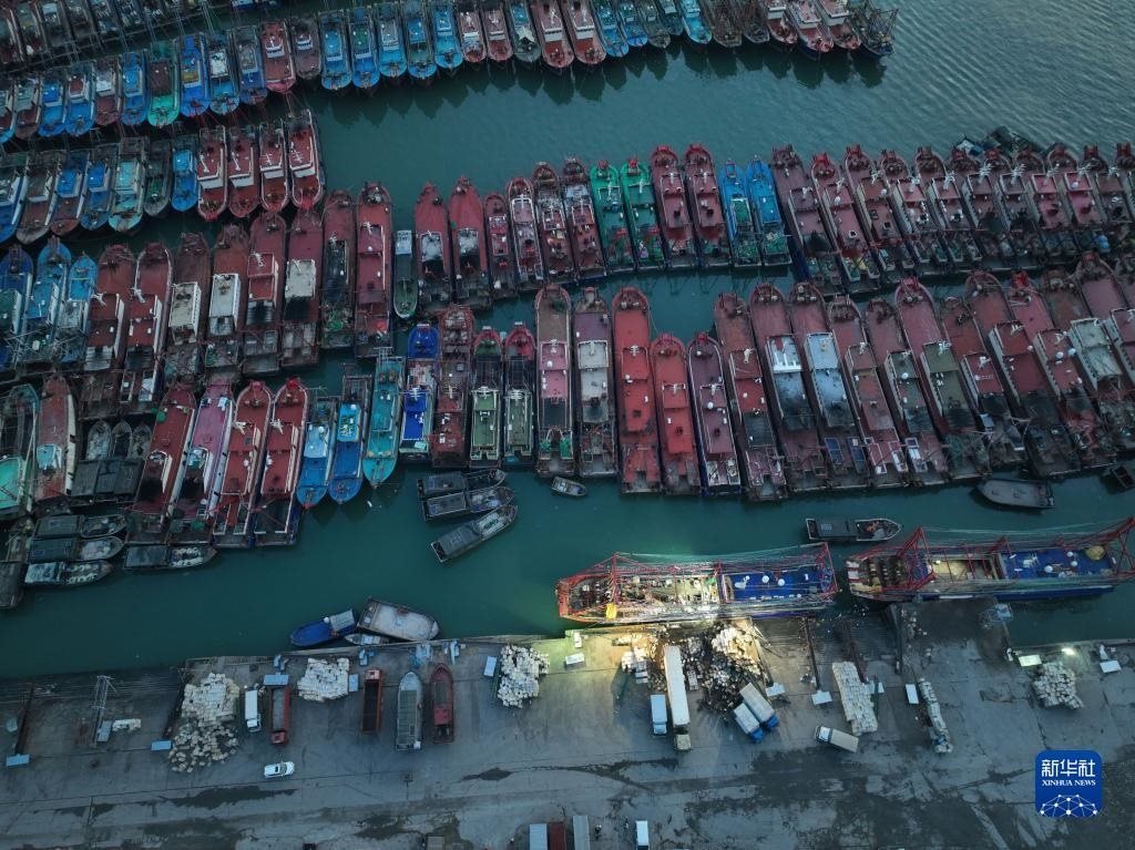4月30日清晨,在浙江省舟山市普陀區(qū)沈家門漁港,漁船陸續(xù)進(jìn)港準(zhǔn)備休漁(無(wú)人機(jī)照片)。   新華社發(fā)(姚峰攝)