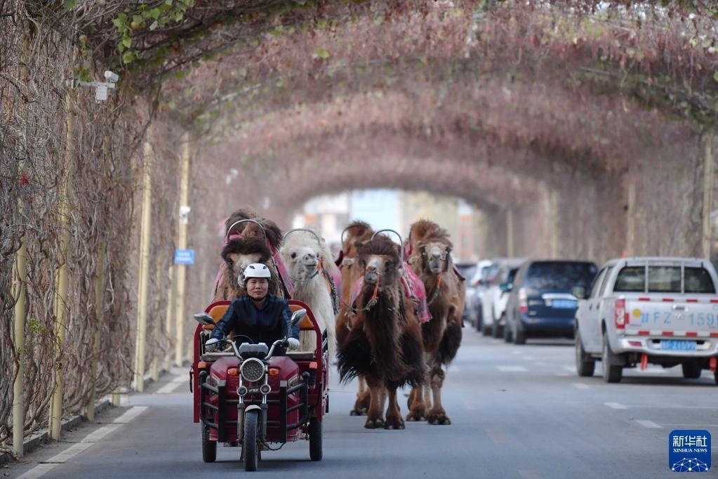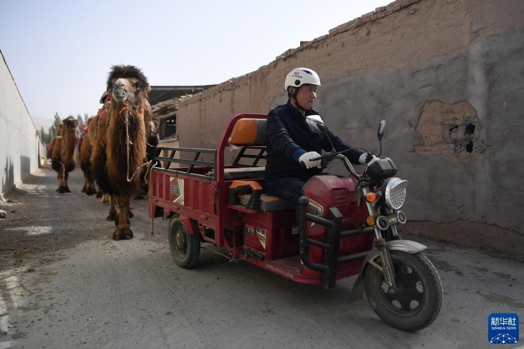 曹文華騎著三輪車(chē)帶著駱駝“下班”(4月24日攝)。