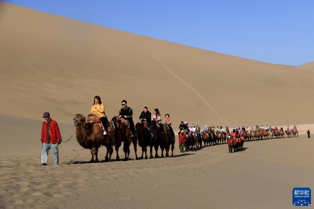 “從前,駱駝是絲綢之路上重要的交通工具;現(xiàn)在,我們的駱駝已變成敦煌絲路旅游上的重要一環(huán),為游客帶來(lái)不一樣的體驗(yàn),也是我們重要的增收手段。”月牙泉村村民曹文華一邊走一邊向游客介紹。