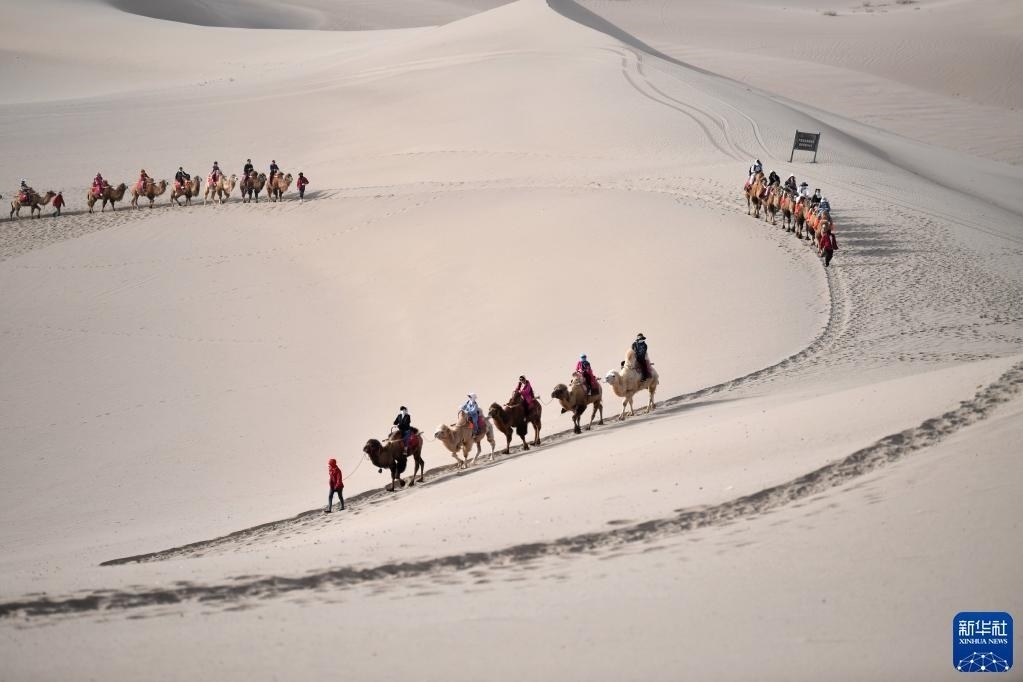 駝隊(duì)載著游客行走在鳴沙山月牙泉景區(qū)的駝道上(4月24日攝)。