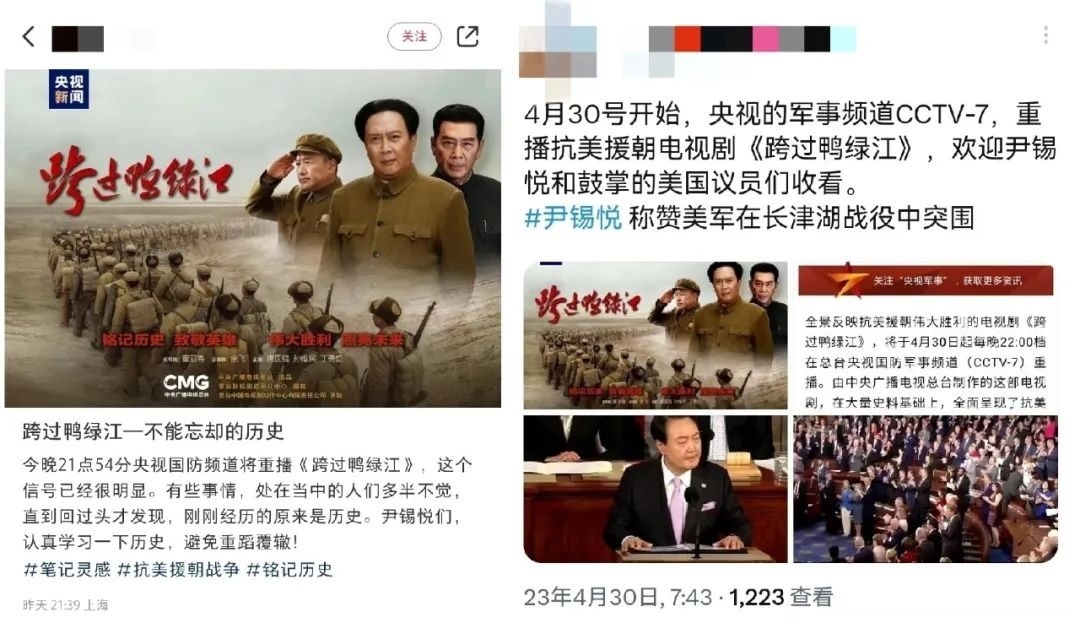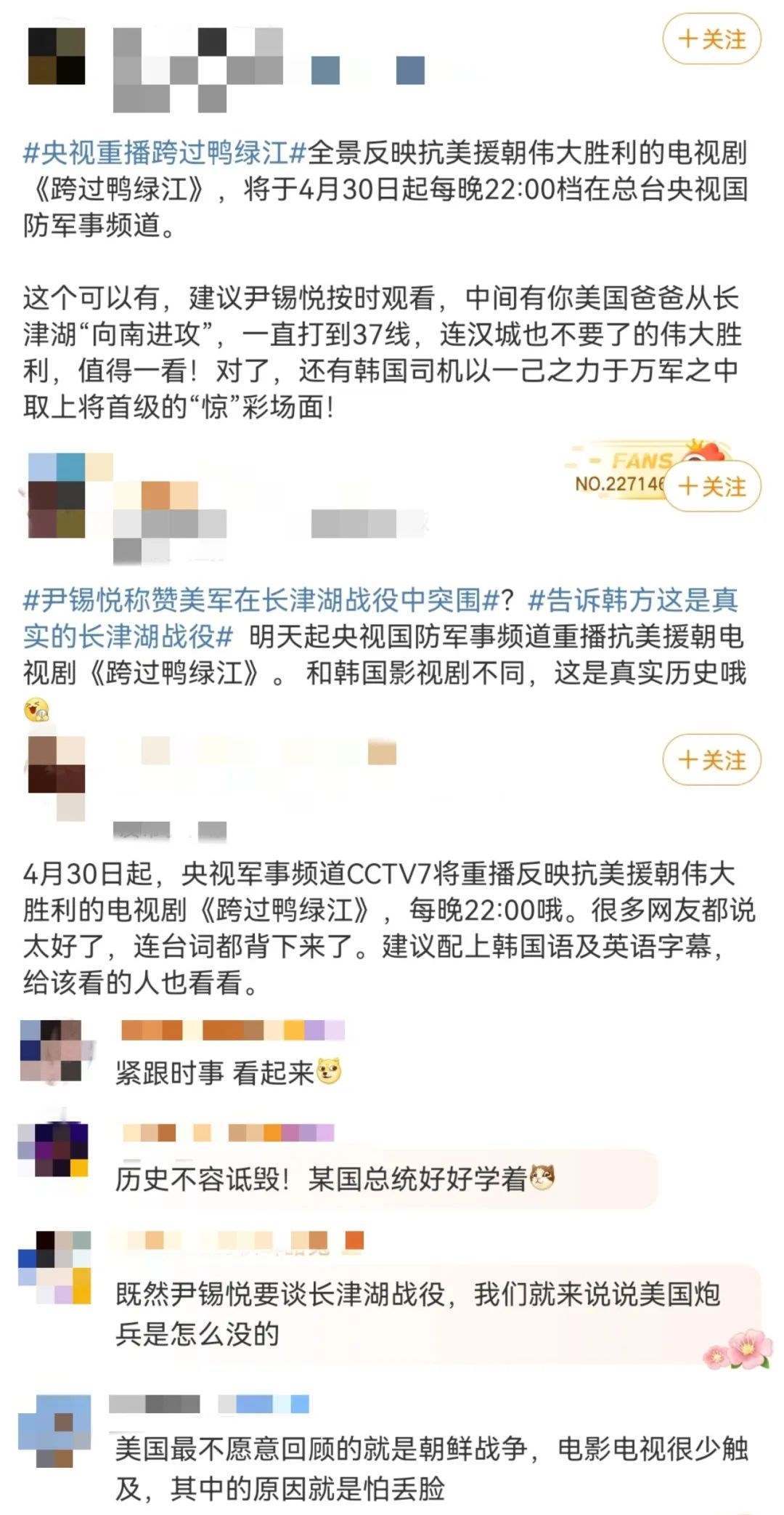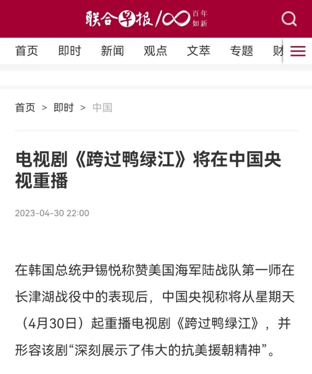 新加坡《聯合早報》更在4月30日晚10點準時發(fā)布文章《電視劇<跨過鴨綠江>將在中國央視重播》,開篇明確重點:在韓國總統(tǒng)稱贊美國海軍陸戰(zhàn)隊第一師在長津湖戰(zhàn)役中的表現后,中國央視稱將從星期天(4月30日)起重播電視劇《跨過鴨綠江》。