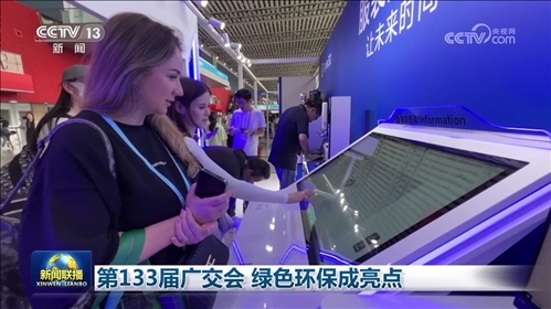 央視網(wǎng)消息(新聞聯(lián)播):第133屆廣交會三期正在進行,綠色理念貫穿在布展、展品和技術(shù)等各個環(huán)節(jié)當(dāng)中。