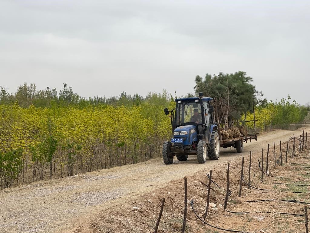 寧夏靈武白芨灘國家級自然保護(hù)區(qū)馬鞍山林場內(nèi),一輛拖拉機(jī)在運(yùn)送樹苗。新華社記者蘇醒 攝