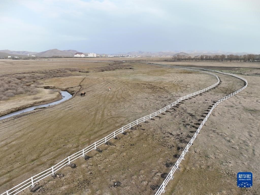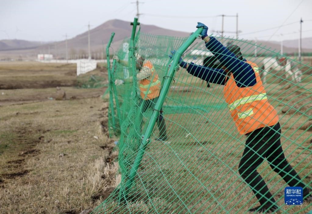 5月2日,河北省承德市豐寧滿族自治縣大灘鎮(zhèn)扎拉營村的護(hù)林員趙世海(右)和羅金寶在海留圖國家濕地公園修復(fù)護(hù)欄。