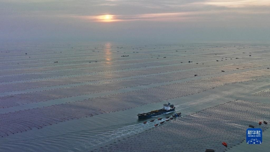 5月2日,在山東省榮成市愛倫灣海洋牧場,收獲海帶的養(yǎng)殖船和運輸鮑魚的運鮮船在養(yǎng)殖區(qū)穿梭(無人機照片)。