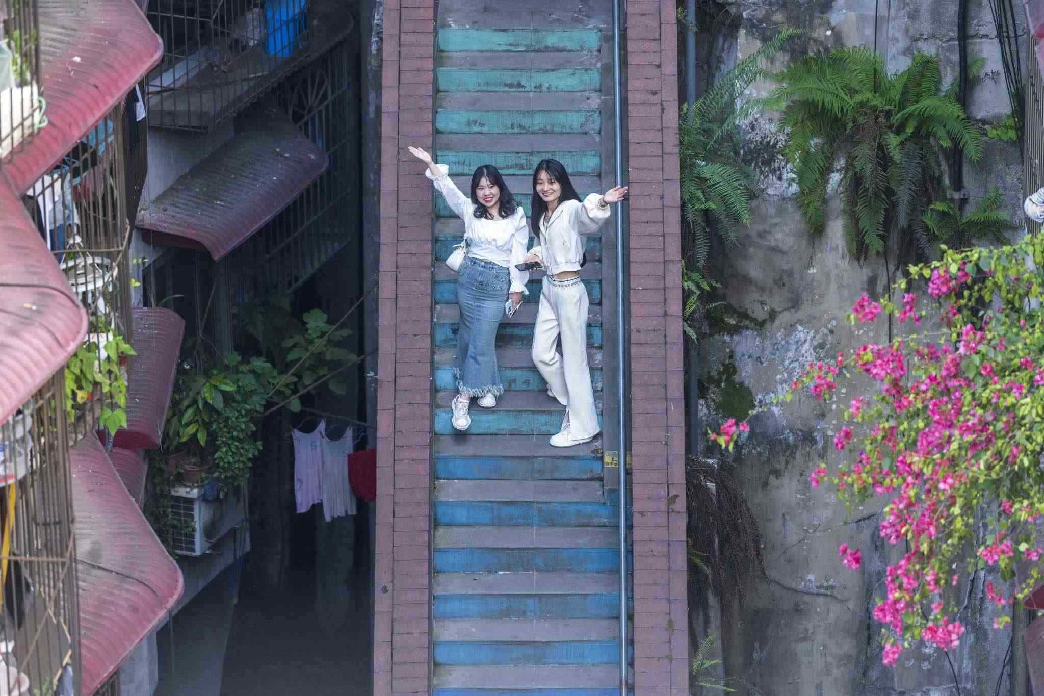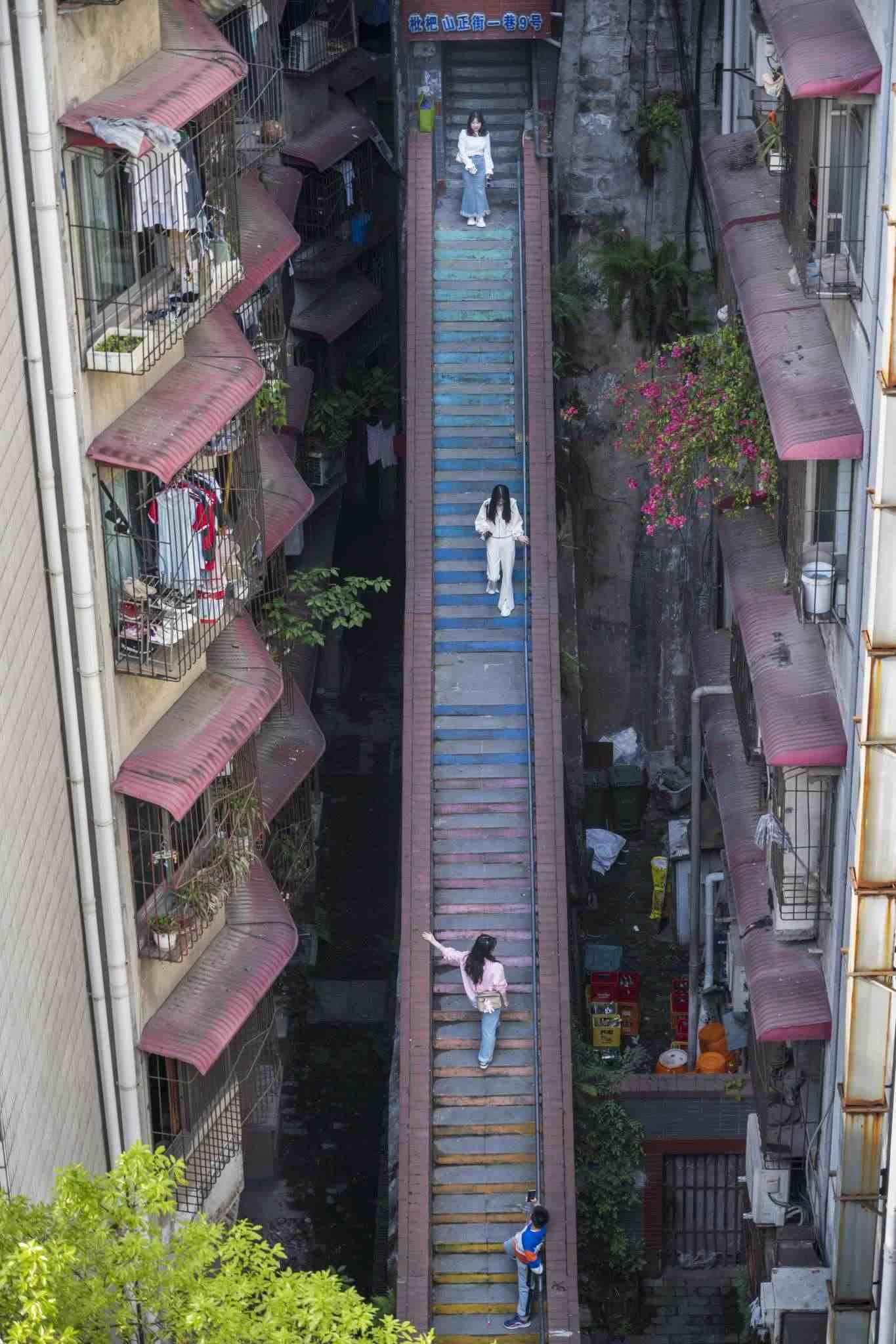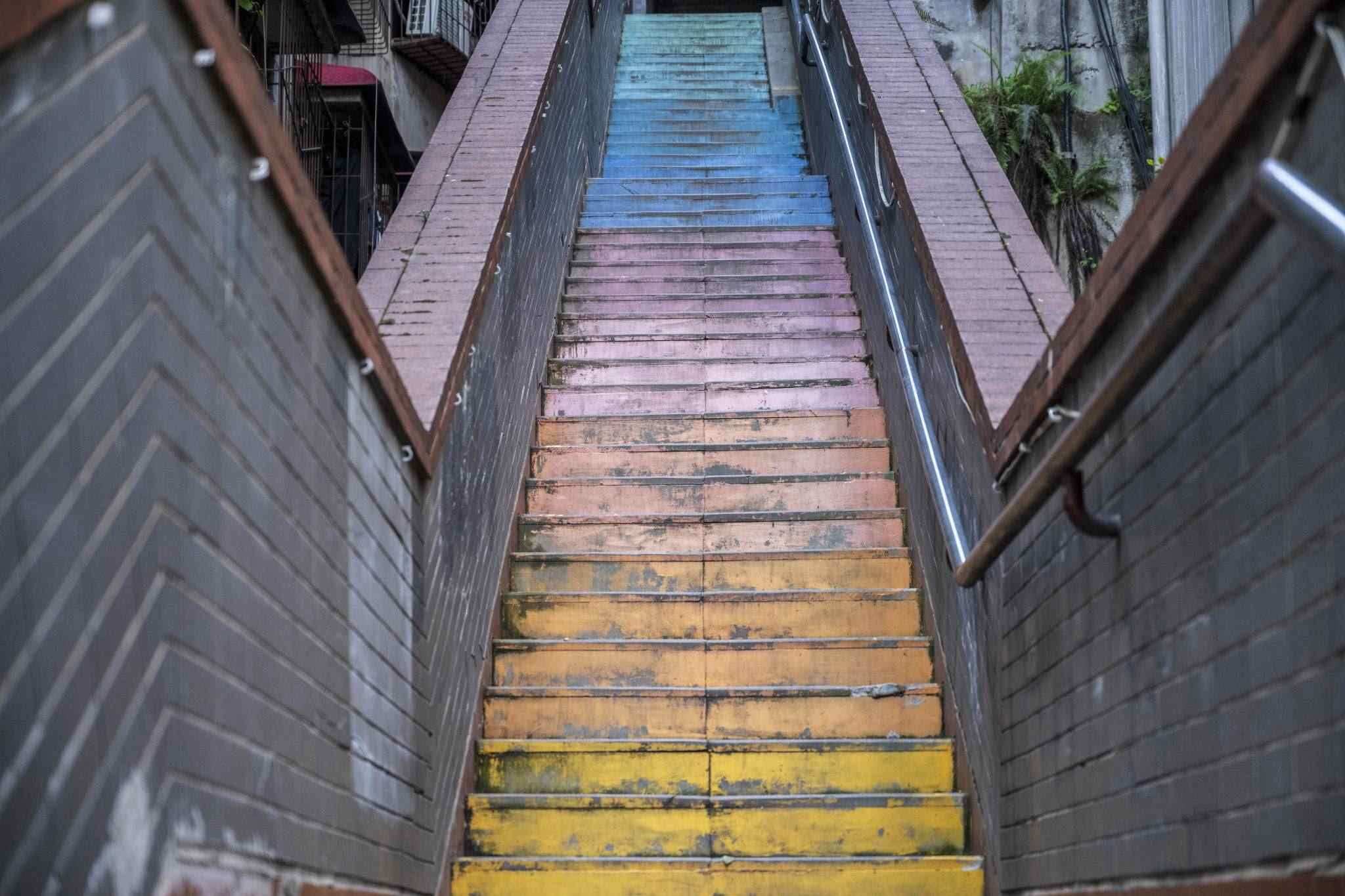 “彩虹樓梯”位于重慶渝中區(qū)枇杷山正街的居民樓間,高約20米,共有50多級(jí)階梯,極具山城特色。經(jīng)過(guò)多種顏色涂鴉后,吸引不少市民和攝影愛(ài)好者“打卡”。視覺(jué)中國(guó)