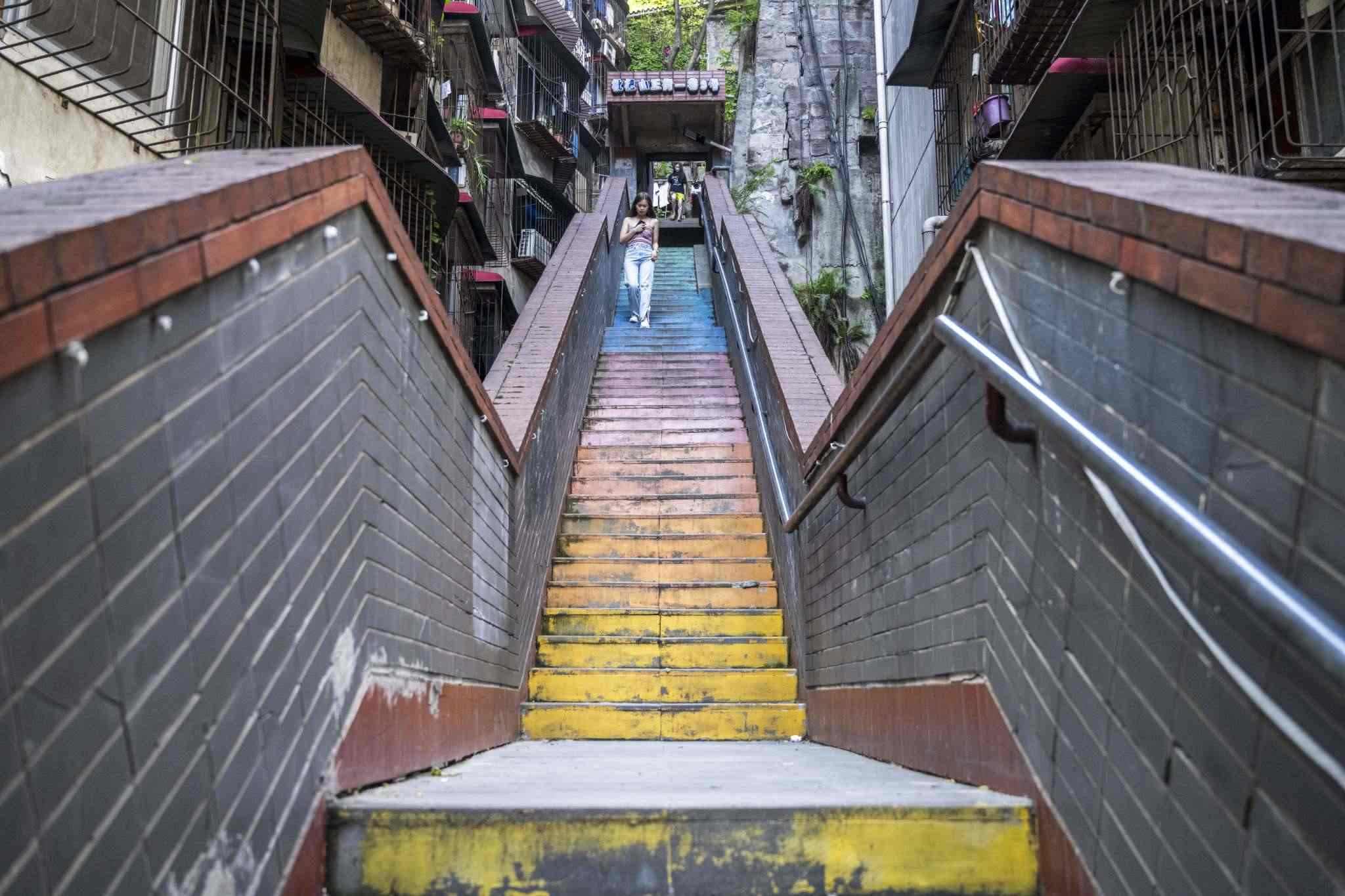 重慶:居民樓現(xiàn)20米高“彩虹樓梯”