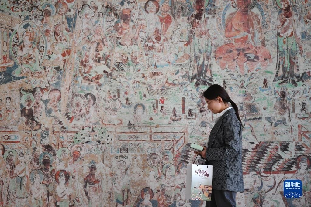 敦煌研究院文物數(shù)字化保護(hù)團(tuán)隊(duì)創(chuàng)意營銷人員廖雪婷從一幅高保真復(fù)制壁畫前走過(4月25日攝)。