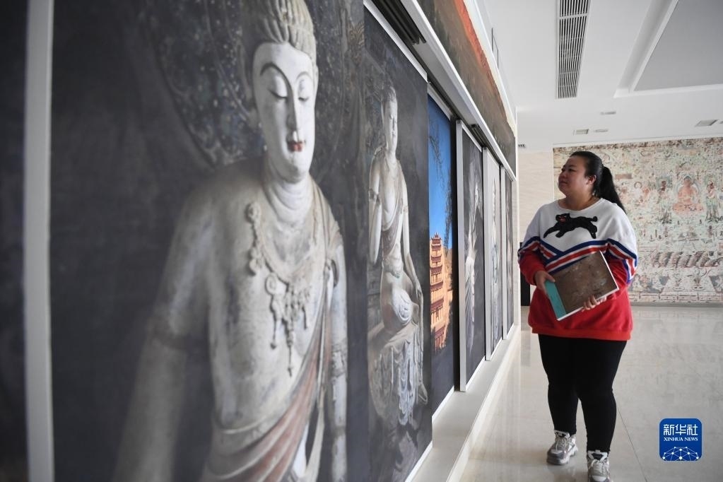 敦煌研究院文物數(shù)字化保護(hù)團(tuán)隊(duì)圖像處理人員年海麗從莫高窟照片墻前走過(4月25日攝)。