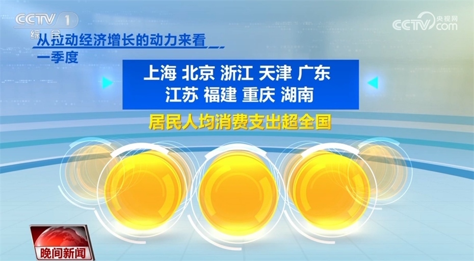 此外,各地經(jīng)濟發(fā)展也呈現(xiàn)回升向好態(tài)勢。目前,全國31個省(區(qū)、市),已經(jīng)全部公布一季度的經(jīng)濟運行數(shù)據(jù)。從GDP增速來看,31個?。▍^(qū)、市)中有23個省份跑贏全國一季度GDP平均增速4.5%,從地區(qū)GDP總量看,有12個省份超1萬億,廣東超過了3萬億。從拉動經(jīng)濟增長的動力來看,一季度,上海、北京、浙江、天津、廣東、江蘇、福建、重慶、湖南9省份,居民人均消費支出超全國。