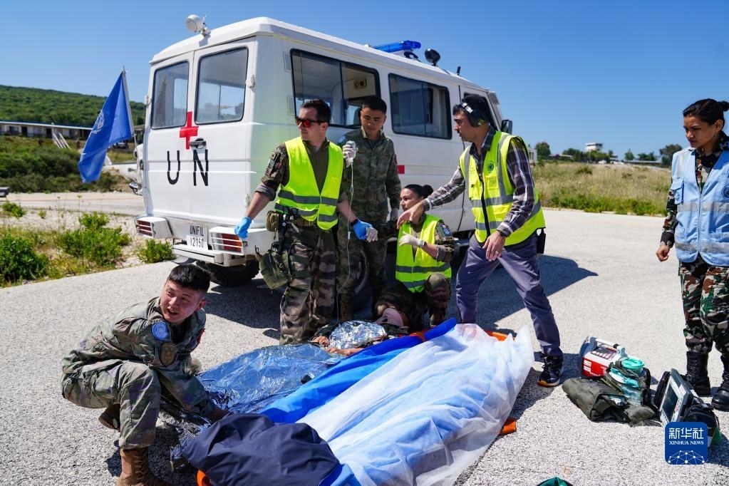 5月3日,在黎巴嫩南部邊境“藍線”附近雷場,參與演習(xí)的中國第21批赴黎巴嫩維和多功能工兵分隊醫(yī)療組對“傷員”傷情進行前期處置。
