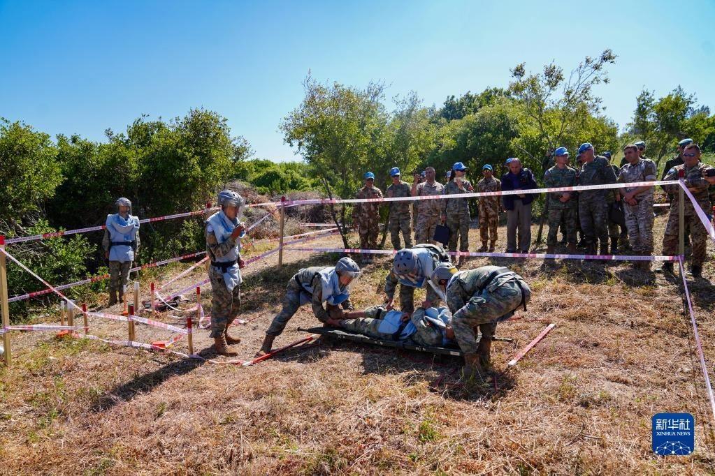 5月3日,在黎巴嫩南部邊境“藍線”附近雷場,參與演習(xí)的中國第21批赴黎巴嫩維和多功能工兵分隊隊員同外軍醫(yī)療分隊交接。