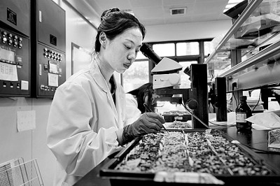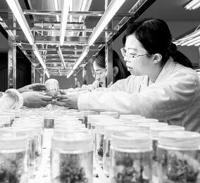 3月29日,在內(nèi)蒙古林業(yè)科學(xué)研究院承擔的“沙地生物資源保護與培育國家林業(yè)和草原局重點實驗室”,科研人員在觀察黑果枸杞組培苗的培養(yǎng)狀態(tài)。丁根厚攝/光明圖片