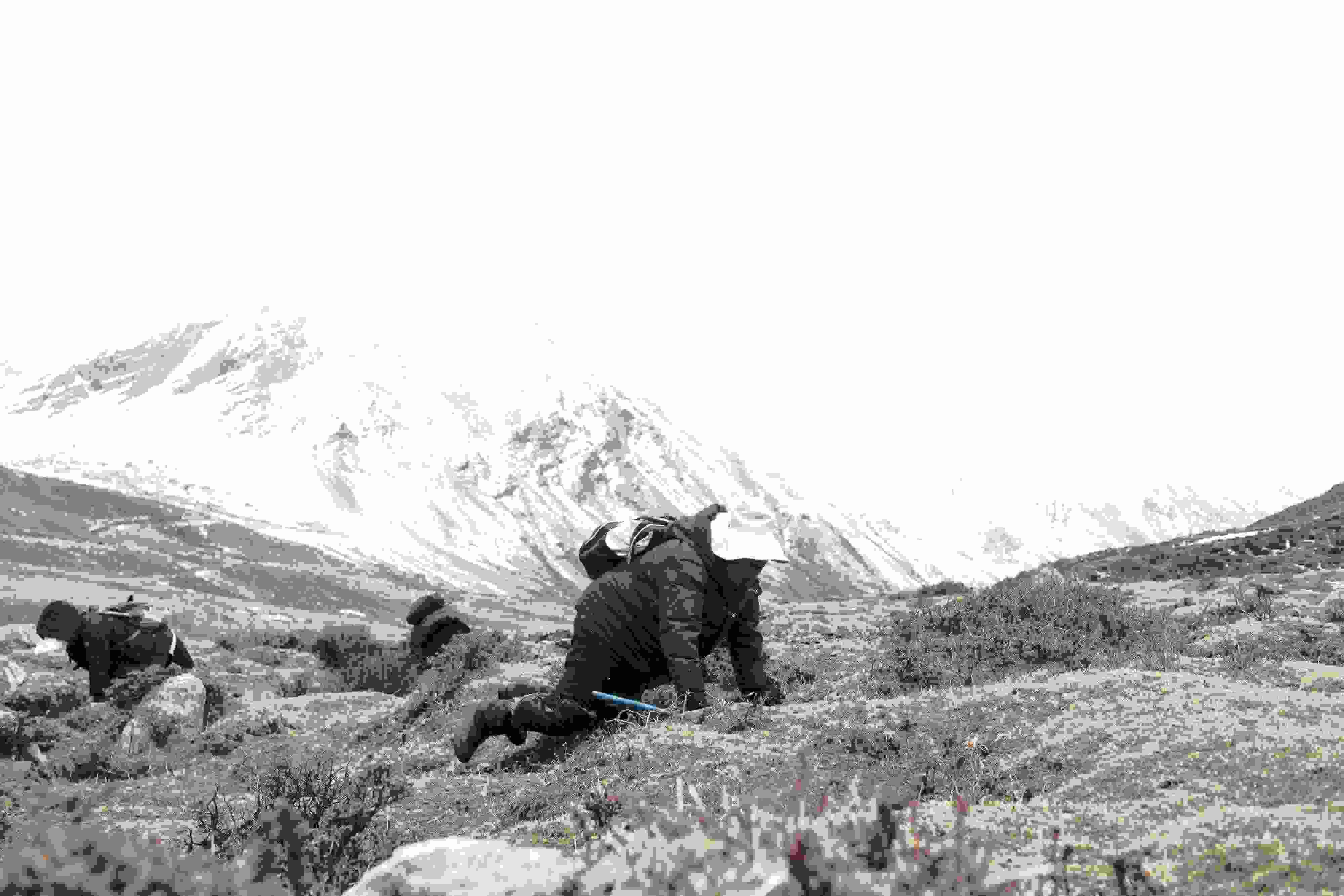 2023年5月7日,西藏山南,加查縣安繞鎮(zhèn)的村民在索囊溝采挖冬蟲夏草。 視覺中國