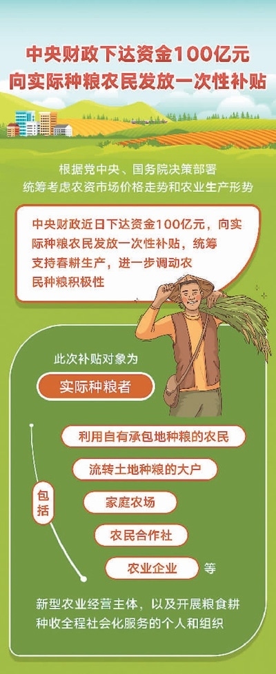 為此,國家統(tǒng)籌考慮農(nóng)資市場價格走勢和農(nóng)業(yè)生產(chǎn)形勢,中央財政向?qū)嶋H種糧農(nóng)民發(fā)放一次性補貼100億元,以穩(wěn)定農(nóng)民收入、保護農(nóng)民種糧積極性。