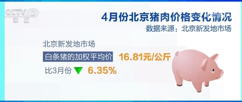 數(shù)據(jù)顯示,4月份北京新發(fā)地市場白條豬的加權(quán)平均價是每公斤16.81元,比3月份下降6.35%,是今年以來的最低價格,也是去年5月份以來的最低價格。市場負責人介紹說,盡管4月份的豬肉消費比3月份有比較明顯的增長,但是供應過剩的局面仍然存在,需求增長的幅度不及供應能力增長的幅度,4月份白條豬的日均上市量在近5年同期中處于中等偏上的位置。