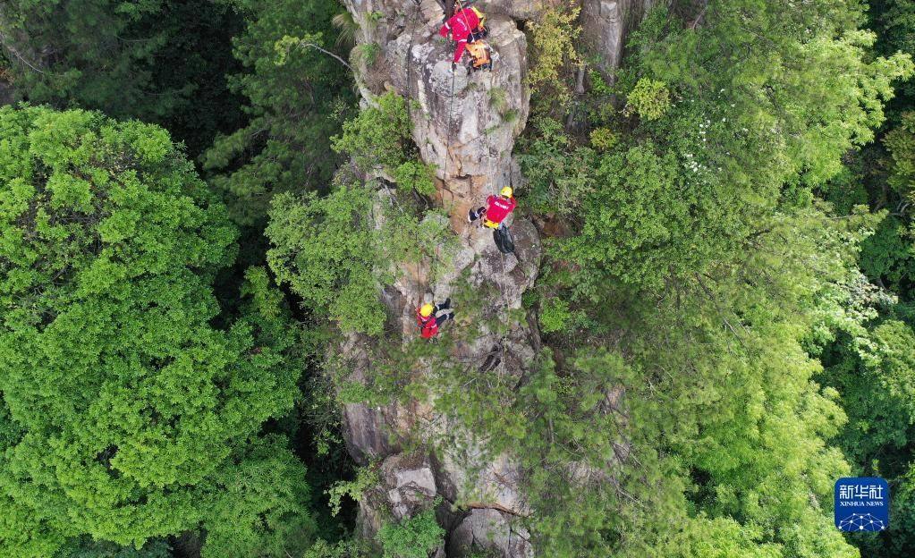5月14日,張家界市武陵源區(qū)山地應(yīng)急救援隊隊員在天子山的絕壁間索降。