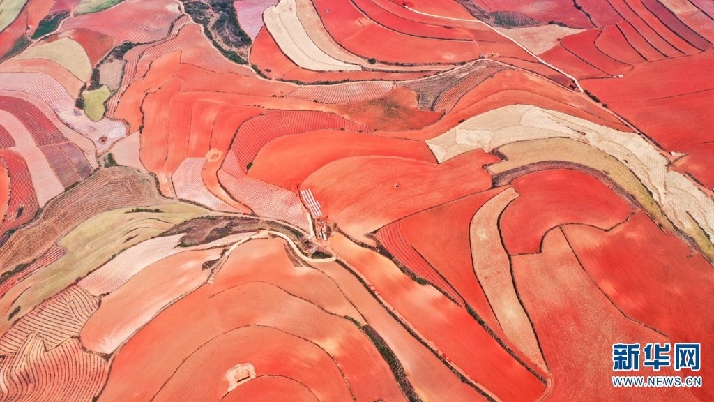云南省尋甸回族彝族自治縣,連綿不斷的旱梯田遍布山間,遠(yuǎn)接天邊,每年4-5月,經(jīng)過村民翻新、平整后的紅褐色土地,從空中俯瞰五彩斑斕、蔚為壯觀。當(dāng)?shù)卮迕裥燎诟旁诜饰值募t土地上,用勤勞的雙手,繪就一幅幅勞動藝術(shù)畫作。新華網(wǎng)發(fā)(孫文來 攝影報(bào)道)
