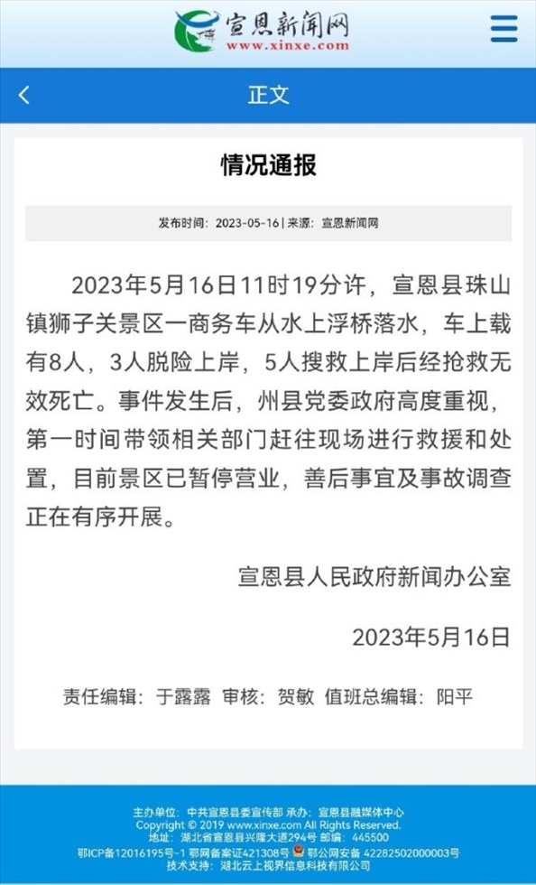·官方通報(bào)“恩施網(wǎng)紅浮橋墜車事故”:5人死亡,景區(qū)已暫停營業(yè)。