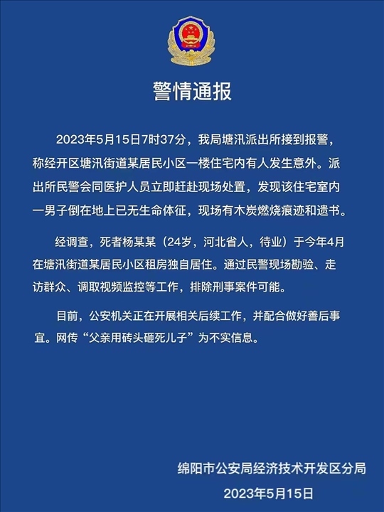 ·網(wǎng)傳“父親用磚頭砸死兒子”?綿陽警方通報(bào):排除刑案可能,現(xiàn)場發(fā)現(xiàn)木炭燃燒痕跡和遺書。