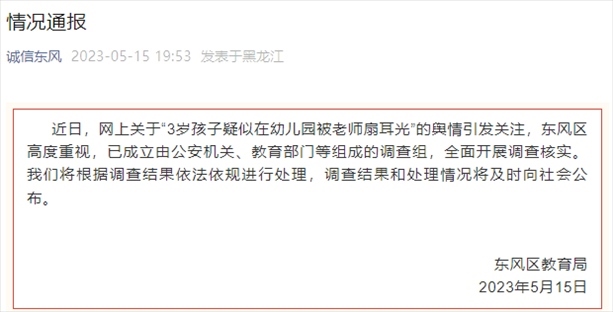 ·網(wǎng)傳“3歲孩子疑被幼師扇耳光”,官方通報(bào):已成立調(diào)查組全面調(diào)查核實(shí)。