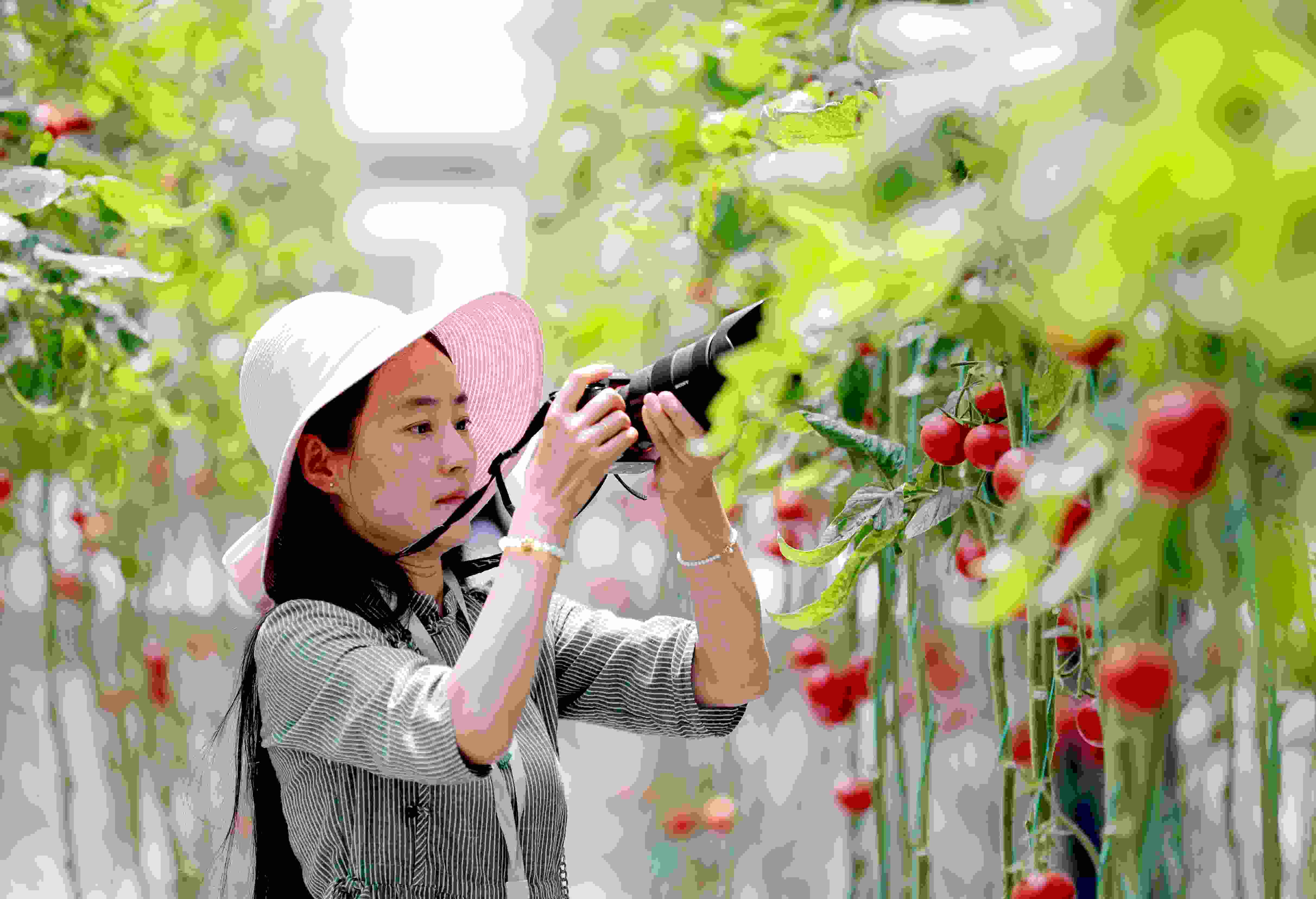 5月15日,游客在青島市即墨區(qū)北安街道一家智慧農(nóng)場體驗(yàn)采摘樂趣。