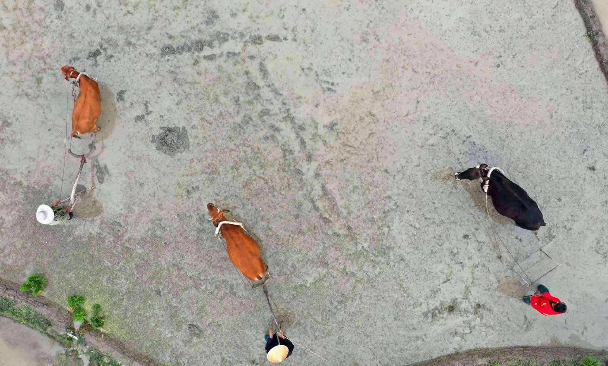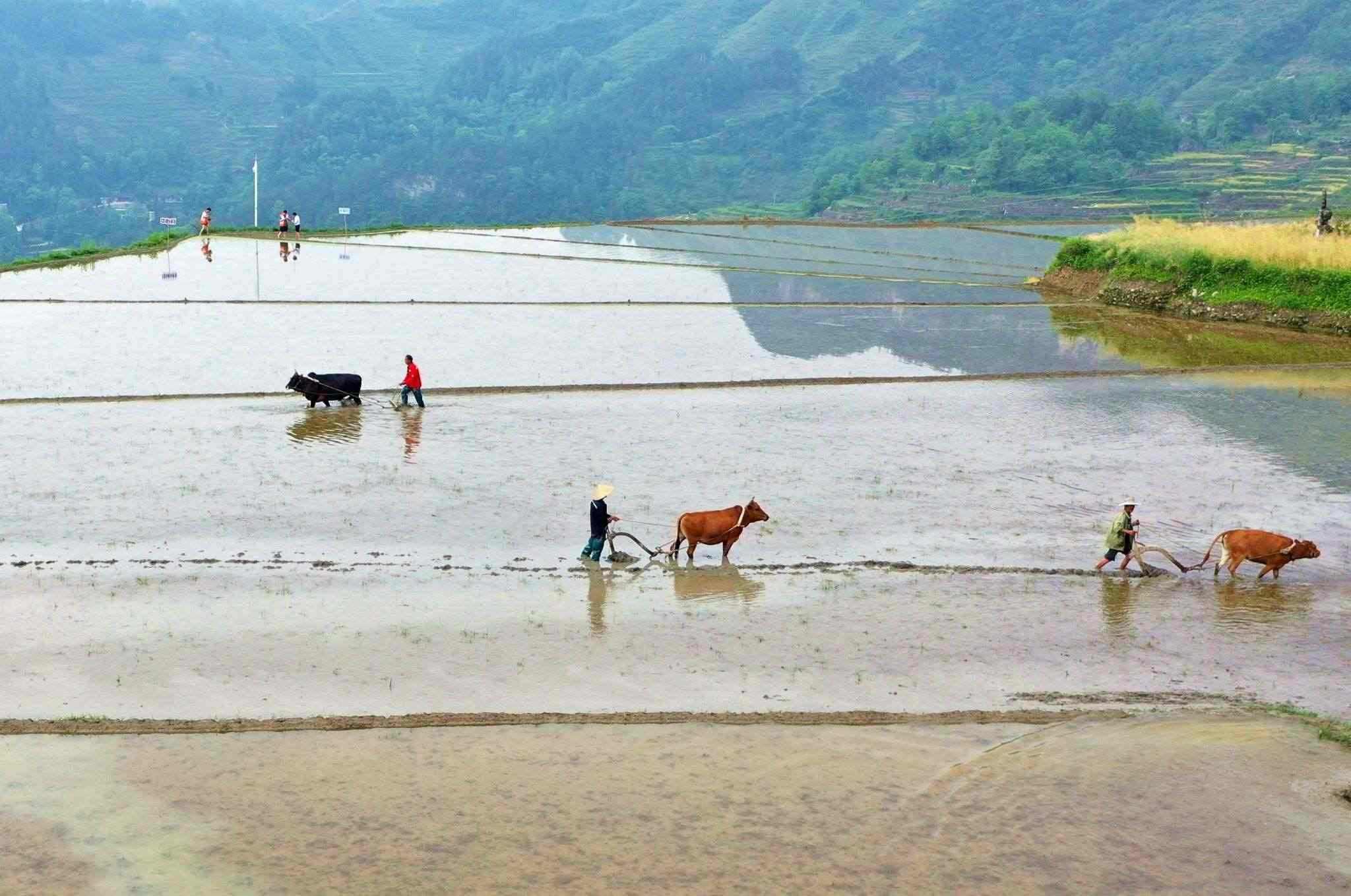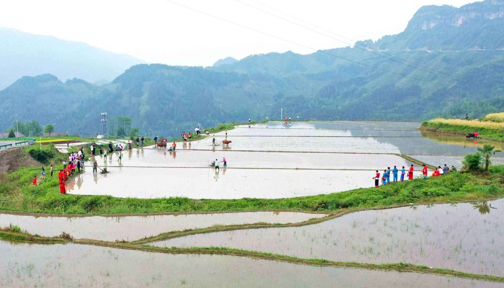 2023年5月19日,重慶,酉陽縣花田鄉(xiāng)何家?guī)r村的梯田里,村民們正在進行犁田插秧比賽,向游客展示農耕文化魅力。視覺中國
