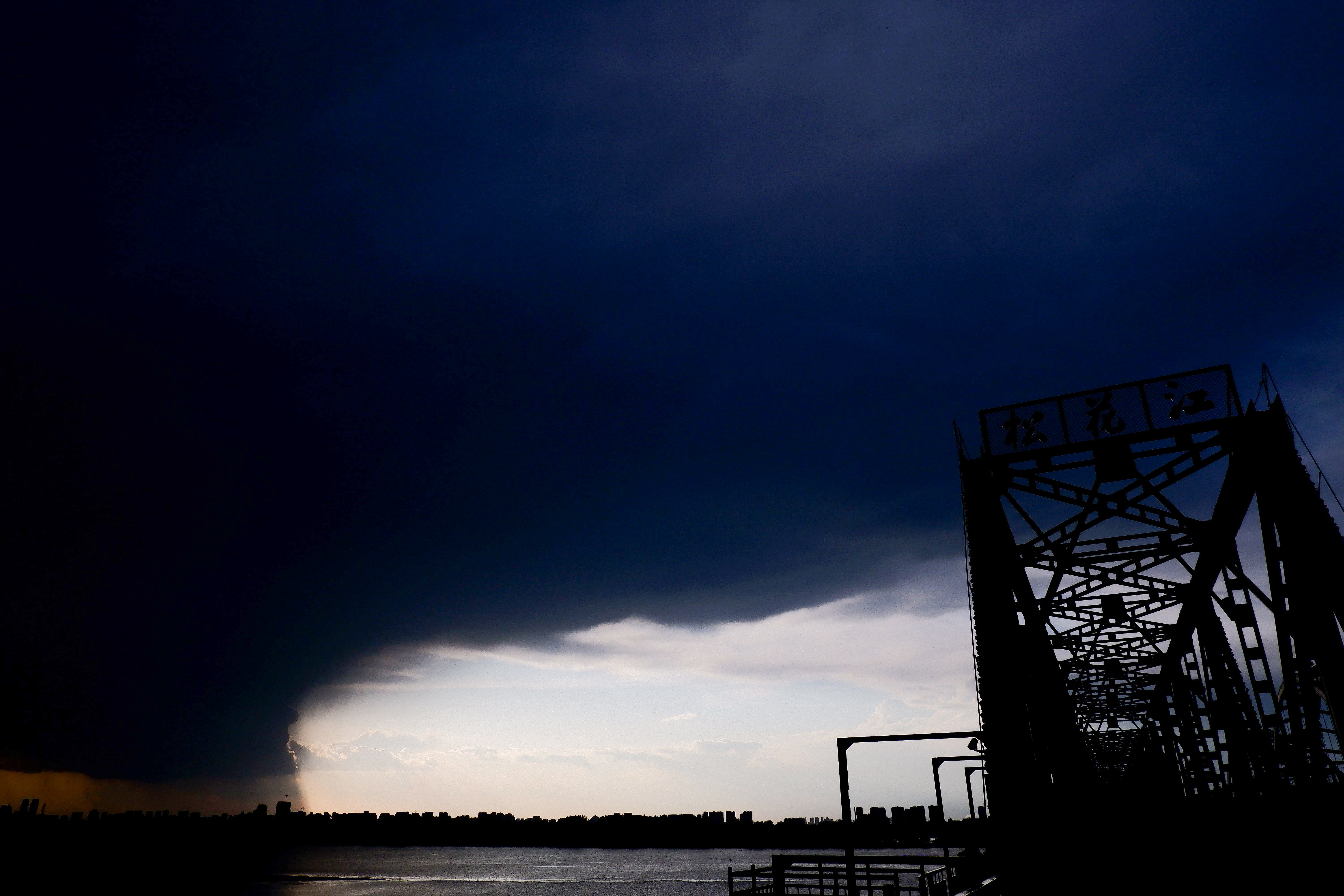 5月21日下午,黑龍江省哈爾濱市迎來強降雨天氣,整座城市被雷暴云籠罩,白晝?nèi)缫梗鹑缟涎菘苹么笃? (吳胡荼 攝)