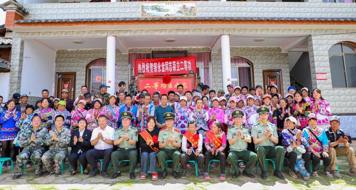 鑼鼓喧天,鞭炮齊鳴。近日,云南省楚雄彝族自治州大姚縣桂花鎮(zhèn)大河村張燈結(jié)彩、熱鬧非凡,武警云南總隊昭通支隊派出送喜報小分隊輾轉(zhuǎn)600余公里來到這里,聯(lián)合當?shù)厝宋洳亢屯艘圮娙耸聞?wù)局,為榮立個人二等功的現(xiàn)役軍人鄒永金的家屬送去喜報、牌匾和慰問金。