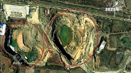 這兩個大坑真的如這位負責人所說變化不大嗎?記者查閱了從2018年至今的衛(wèi)星圖片,上面清晰顯示:2018年,北面大坑上面原來有廠房,還有道路,南面是一個尾礦庫。2019年,地塊南北同時出現(xiàn)新挖的坑,之后這兩個坑不斷擴大。到了2020年,北面的廠房已經不見了,南面的坑也在變大。2021年、2022年,兩個大坑都在變大變深,逐漸靠攏,到了2023年,最終形成了現(xiàn)在的樣子。