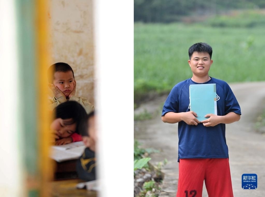 拼版照片:左圖為2012年7月4日,在大化瑤族自治縣板升鄉(xiāng)弄勇小學(xué),7歲的蒙錦晨在課堂上;右圖為2023年1月25日,在大化瑤族自治縣板升鄉(xiāng)弄勇村,正在浙江省臺州職業(yè)技術(shù)學(xué)院讀大一的蒙錦晨寒假回家時在村中留影。 新華社記者 黃孝邦 攝
