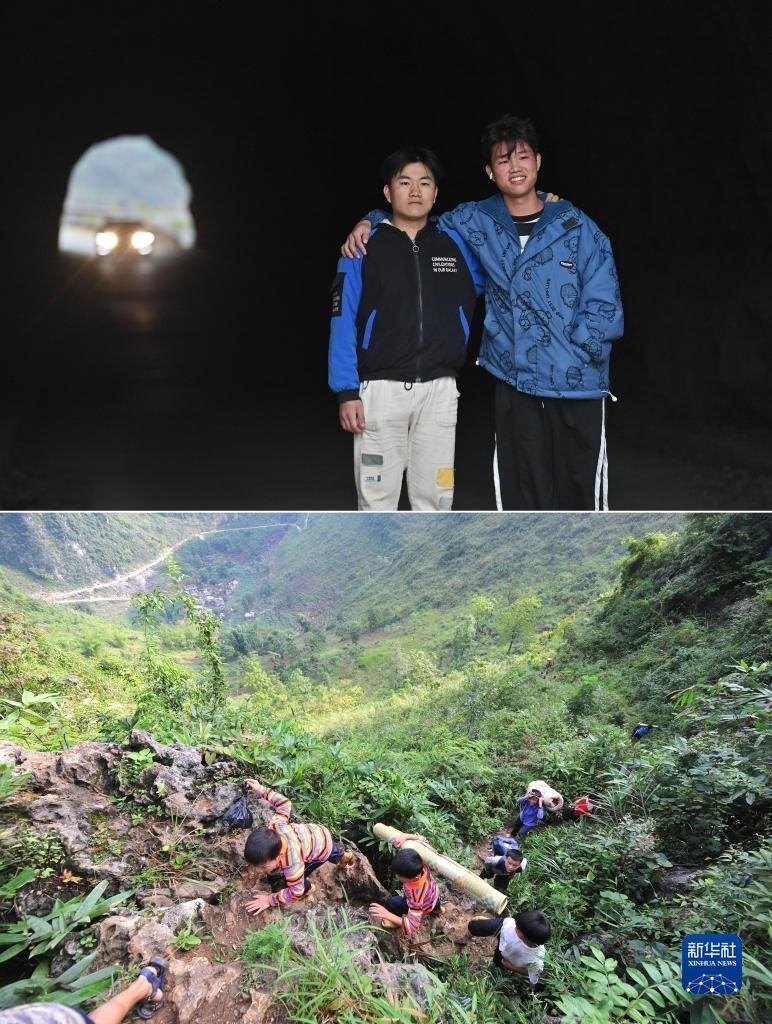 拼版照片:上圖為2023年1月20日,在大化瑤族自治縣板升鄉(xiāng)弄勇村,22歲的蒙宣任(左)和弟弟蒙宣汰站在通往弄勇小學(xué)的隧道旁合影,隧道上方是他們兒時上學(xué)需要攀爬的“天梯”;下圖為2012年9月3日,在大化瑤族自治縣板升鄉(xiāng)弄勇村,蒙宣汰(左一)、蒙宣任(左二)爬山路去學(xué)校。蒙宣任目前在遼寧省交通高等專科學(xué)校讀書,弟弟蒙宣汰從技校畢業(yè)后在廣東一家汽修廠上班。