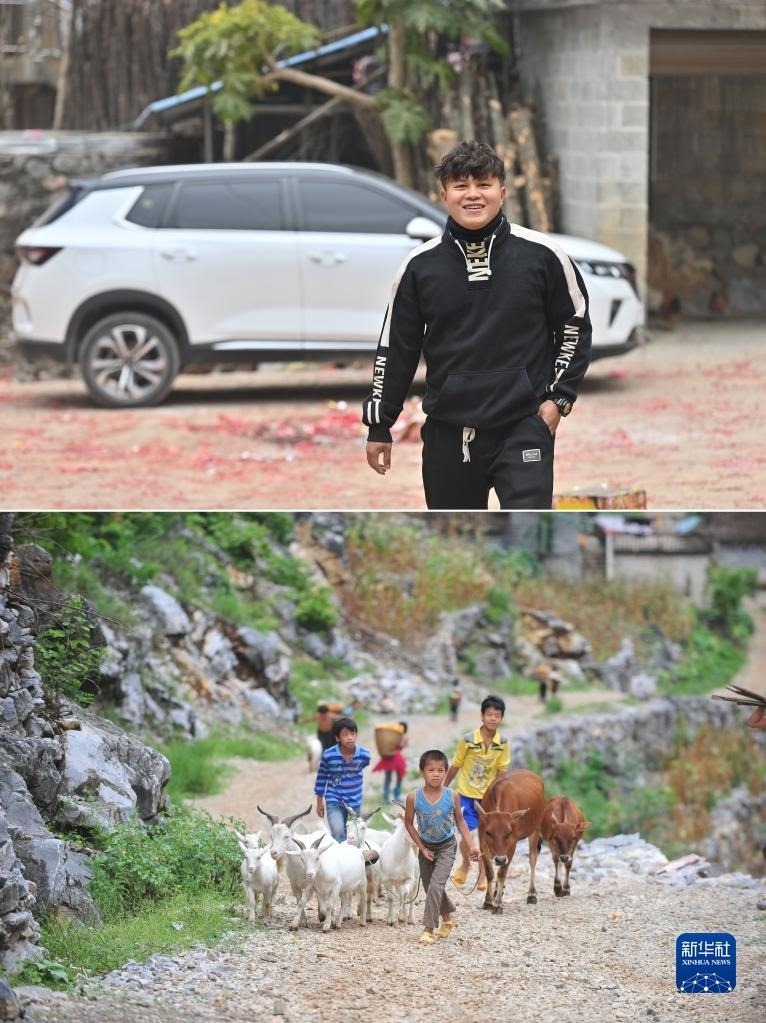 拼版照片:上圖為2023年1月21日,在大化瑤族自治縣板升鄉(xiāng)弄勇村,22歲的蒙宣朝站在自己剛剛購買的汽車前;下圖為2012年7月16日,在大化瑤族自治縣板升鄉(xiāng)弄勇村,11歲的蒙宣朝(前)利用暑假幫家里放牧。技校畢業(yè)后,蒙宣朝到廣東工作。