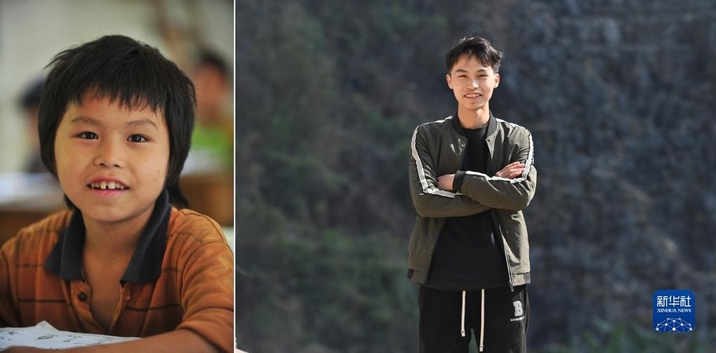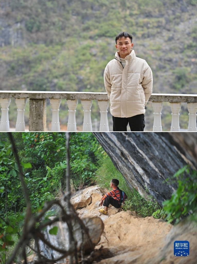 拼版照片:上圖為2023年1月16日,在大化瑤族自治縣板升鄉(xiāng)弄雷村,即將從技校畢業(yè)的蒙科佑站在家門口;下圖為2012年9月5日,在大化瑤族自治縣板升鄉(xiāng)弄雷村,10歲的蒙科佑在上學(xué)途中,坐在懸崖邊上休息。21歲的蒙科佑,希望能掙錢供弟弟妹妹讀書,讓他們接受更好的教育。
