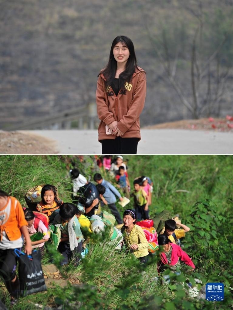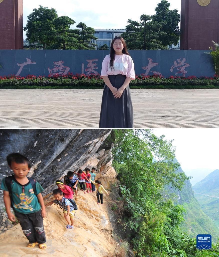 拼版照片:上圖為2023年5月27日,22歲的蒙秋艷站在她就讀的廣西醫(yī)科大學(xué)校門口(新華社發(fā));下圖為2012年9月3日,在大化瑤族自治縣板升鄉(xiāng)弄雷村哈保屯,11歲的蒙秋艷(右一)在懸崖邊護(hù)著低年級的小伙伴回家(新華社記者黃孝邦攝)。2021年,蒙秋艷以優(yōu)異的成績,考取廣西醫(yī)科大學(xué)。
