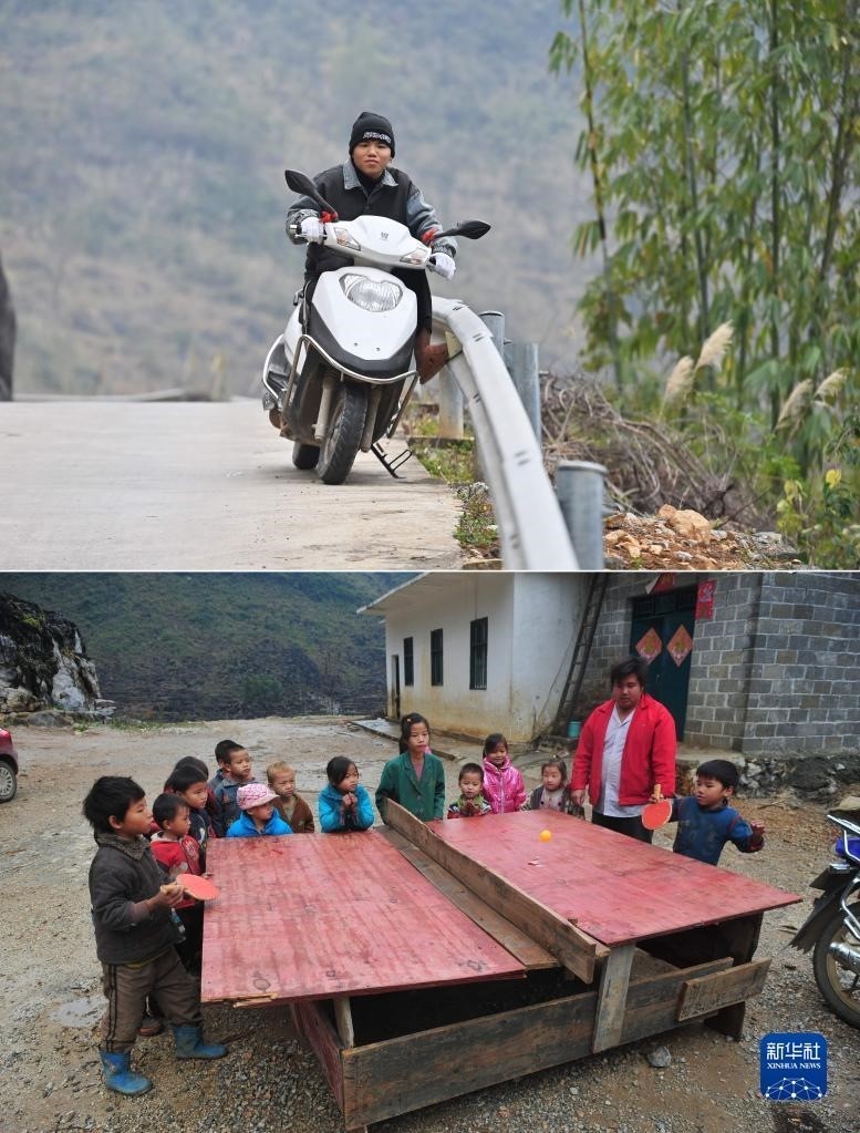 拼版照片:上圖為2023年1月26日,在大化瑤族自治縣板升鄉(xiāng)弄勇村,在廣東工作、返鄉(xiāng)過年的蒙宣海在路邊休息;下圖為2012年12月27日,在弄勇村弄頂教學(xué)點,7歲的蒙宣海(右一)在打乒乓球。2022年,蒙宣海技校畢業(yè)后,選擇去廣東工作。