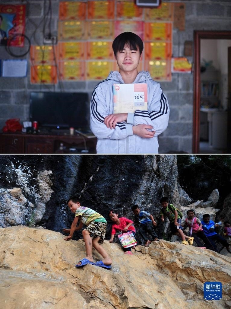 拼版照片:上圖為2023年1月26日,在大化瑤族自治縣板升鄉(xiāng)弄雷村,大化瑤族自治縣高級中學(xué)高二學(xué)生蒙文超站在家里,身后的墻上貼滿獎狀;下圖為2012年9月5日,在大化瑤族自治縣板升鄉(xiāng)弄雷村,7歲的蒙文超(左一)放學(xué)后爬懸崖回家。今年18歲的蒙文超最大的夢想是一年后考上理想的大學(xué)。