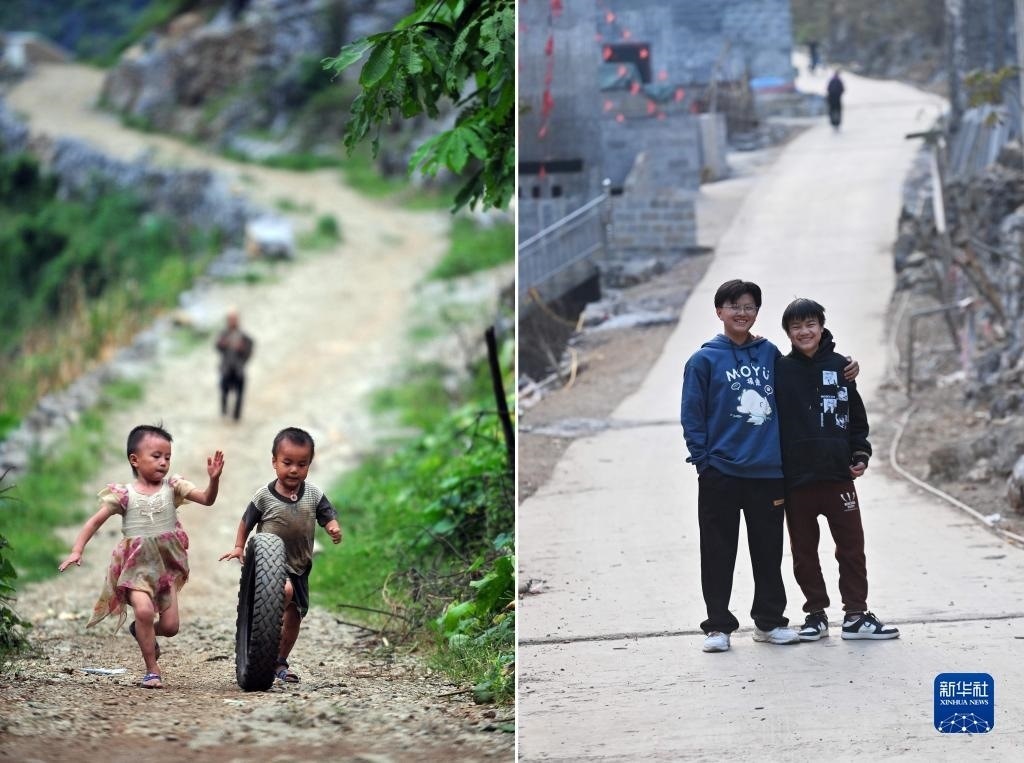 拼版照片:左圖為2012年7月16日,在大化瑤族自治縣板升鄉(xiāng)弄勇村,4歲的蒙宣宏(左)穿著姐姐的舊衣服和同為4歲的藍(lán)小帥在一起玩耍;右圖為2023年1月21日,在大化瑤族自治縣板升鄉(xiāng)弄勇村,蒙宣宏(左)和藍(lán)小帥合影。蒙宣宏和藍(lán)小帥目前分別在板升鄉(xiāng)和大化縣城讀初二。