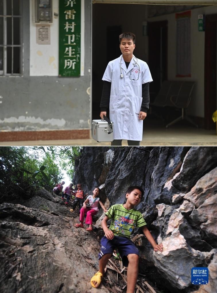 拼版照片:上圖為2023年5月24日,村醫(yī)蒙富松站在大化瑤族自治縣板升鄉(xiāng)弄雷村衛(wèi)生所前(新華社記者胡星宇攝);下圖為2012年9月5日,10歲的蒙富松(右一)爬懸崖去學(xué)校讀書(新華社記者黃孝邦攝)。2021年,蒙富松從衛(wèi)校畢業(yè),回到家鄉(xiāng)成為一名村醫(yī)。 新華社發(fā)